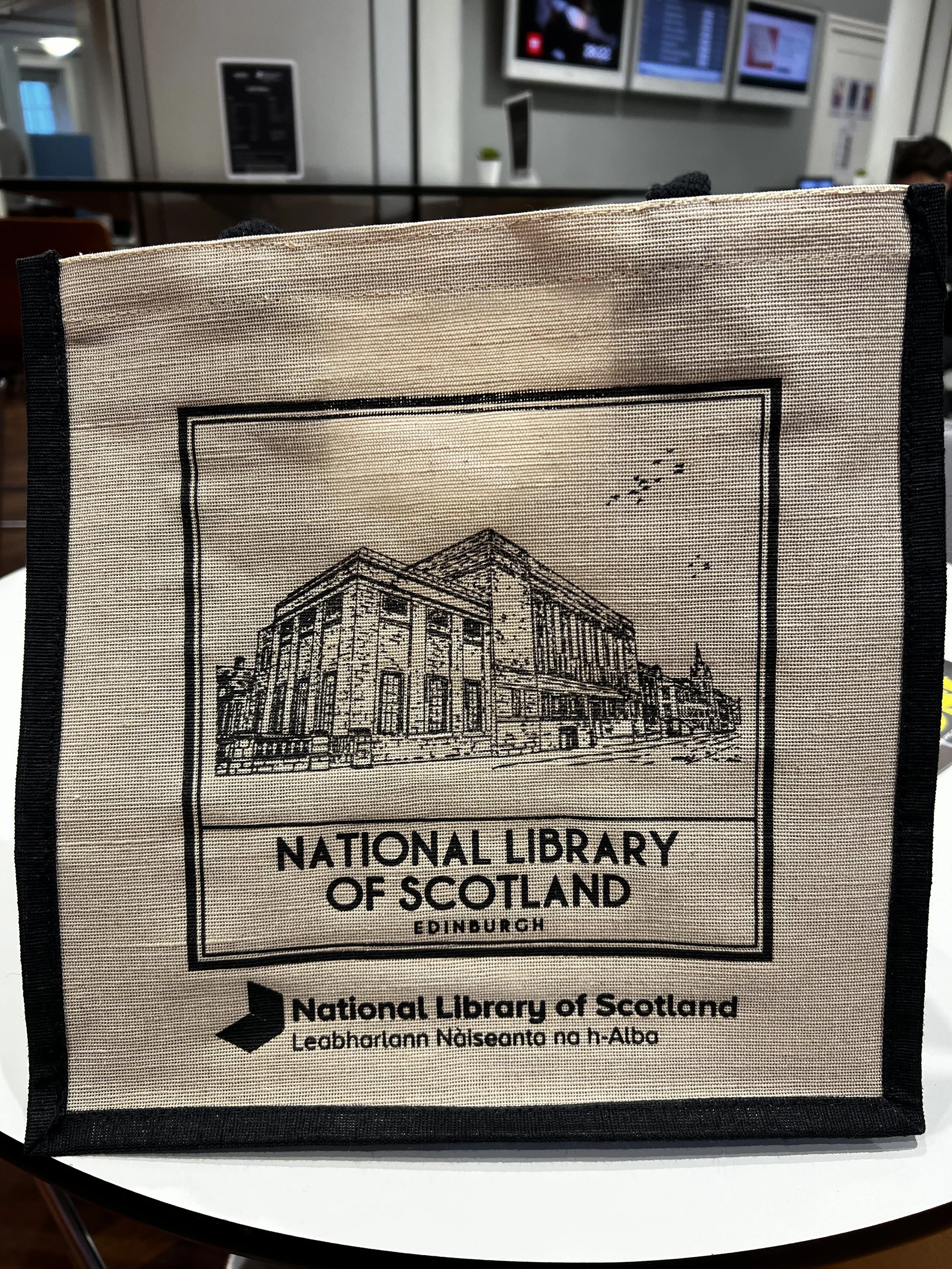 Mom, I know you certainly don’t need another bag, but this would be a good one for you! We meandered through the Library and found they had a rather extensive exhibit on Ian Rankin. There was an associated exhibit on the extensive use of nom de plumes by authors. We were both shocked to learn how many authors use pen names and the various reasons why.