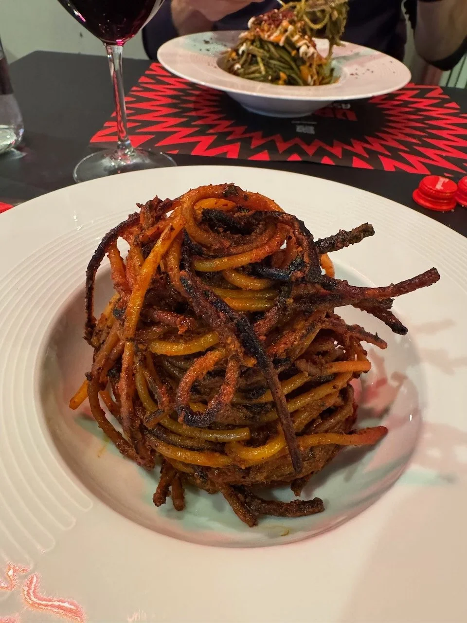 Meanwhile, Dave made a lunch booking at the popular Urban Assassineria restaurant in Bari. Instead of traditional boiling, spaghetti all'assassina (assassin's spaghetti) or spaghetti bruciati (burnt spaghetti) is cooked directly in the pan—traditionally cast iron. A broth typically made of tomato sauce diluted with water is gradually added to the pan and the pasta absorbs it, similar to a risotto. As the spaghetti absorbs the sauce, it cooks directly on the pan surface, developing significant browning and a distinctive and uniquely crispy texture.