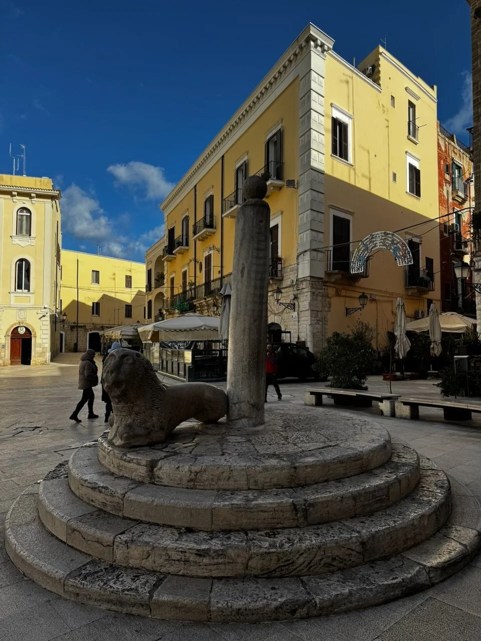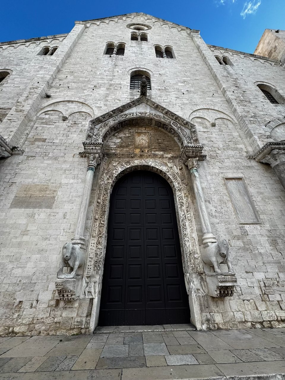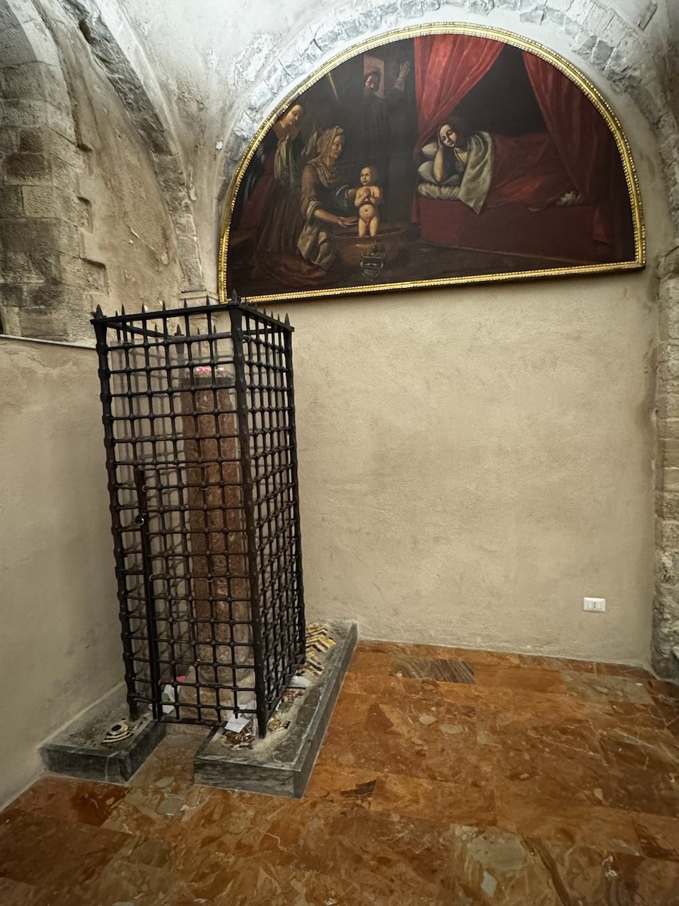 According to legend, when the Church of St Nicholas (adjacent our apartment) was being built to house St Nicholas’s relics after they were brought to Bari in 1087, the construction lacked one final column. The legend tells that on the night between September 30 and October 1, 1089, St Nicholas himself appeared, escorted by two angels, and placed this reddish column into the crypt.