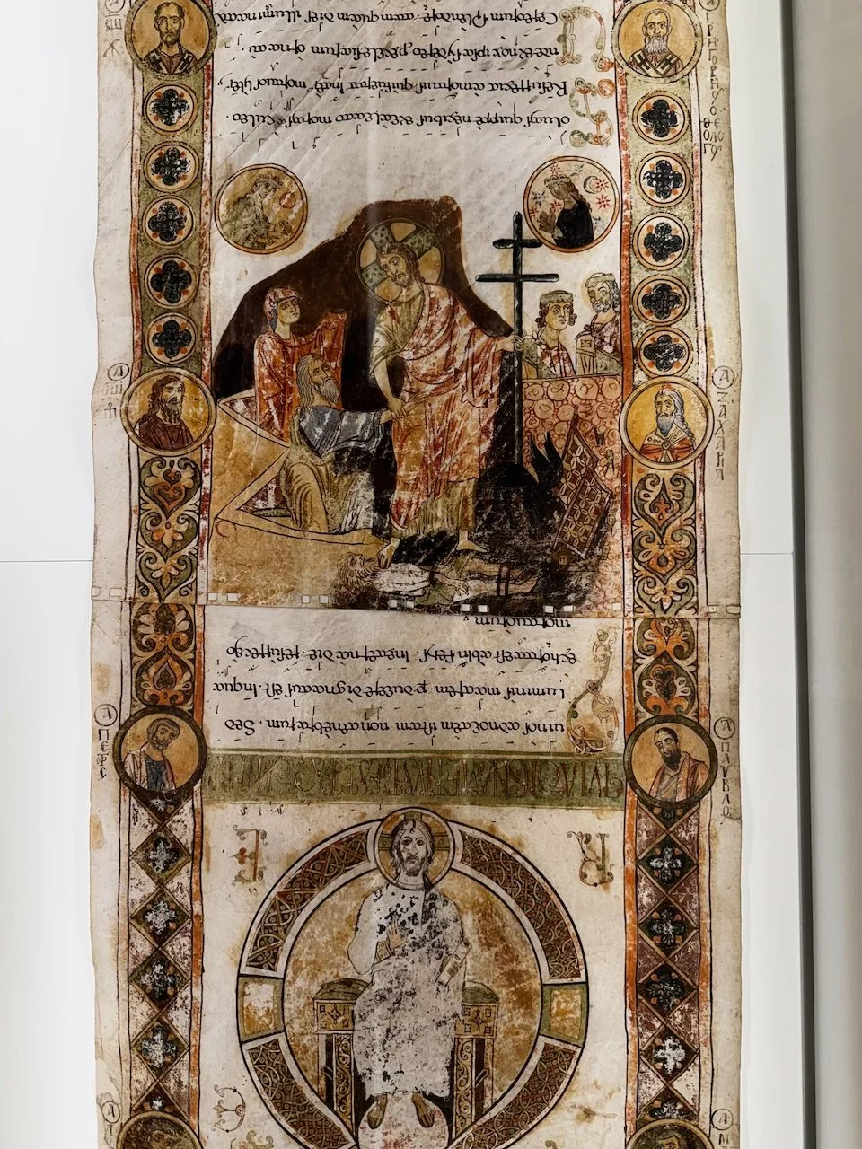 Parchment is the untanned skins of sheep, calves, or goats. The longest Exultet scroll in Bari came from the Monastery of San Benedetto and measures about 17 feet in length. You can see the stitching where the eight rectangular sheepskin folios were sewn together. It is thought that just 28 Exultet still exist today, and 3 of these are preserved in Bari.