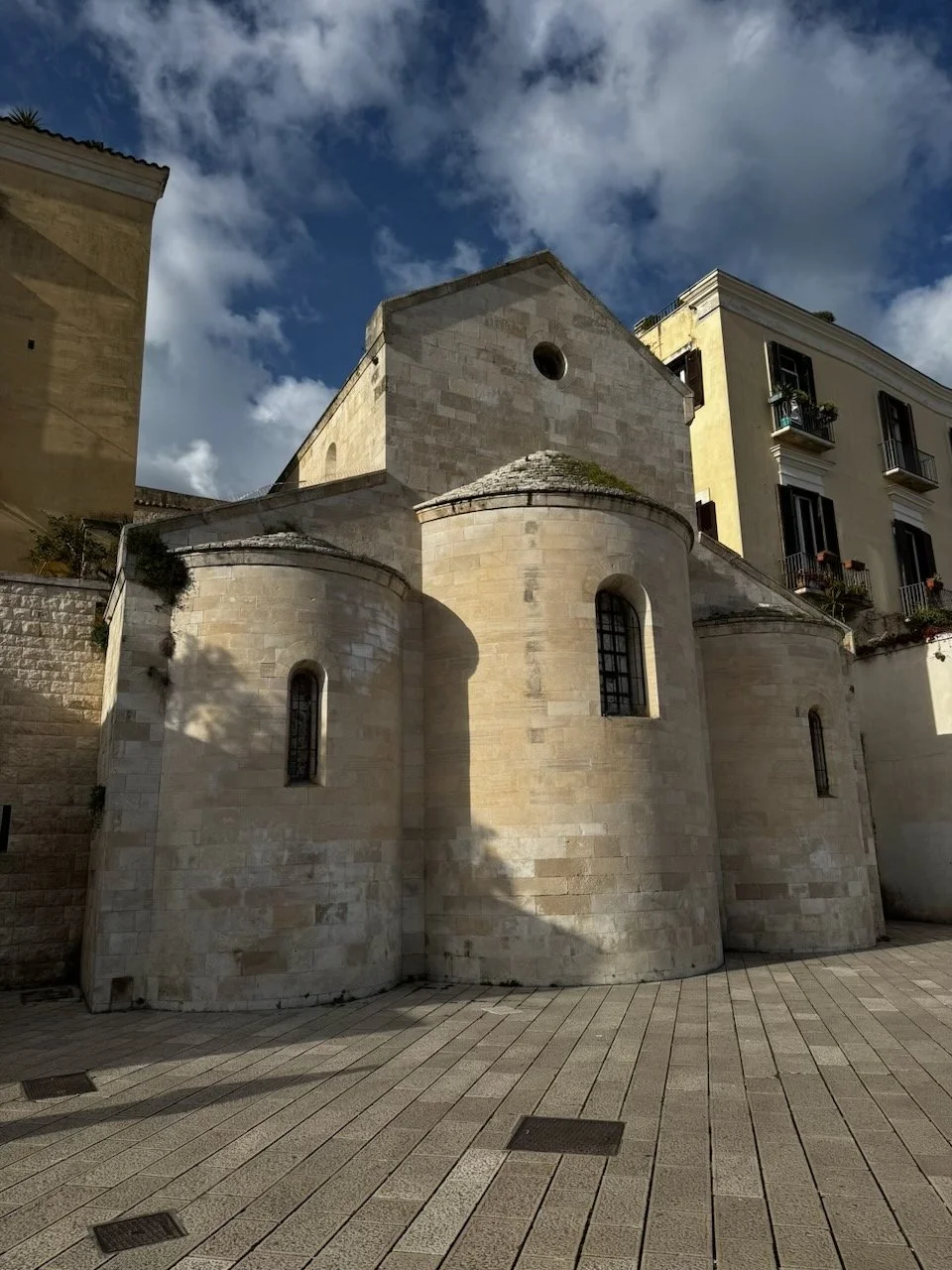 This beautiful, small Romanesque basilica of Chiesa della Vallisa was built in the 11th century. It sits in Piazza Del Ferrarese next to an exposed section of Via Appia Traiana, completed around 109 CE.