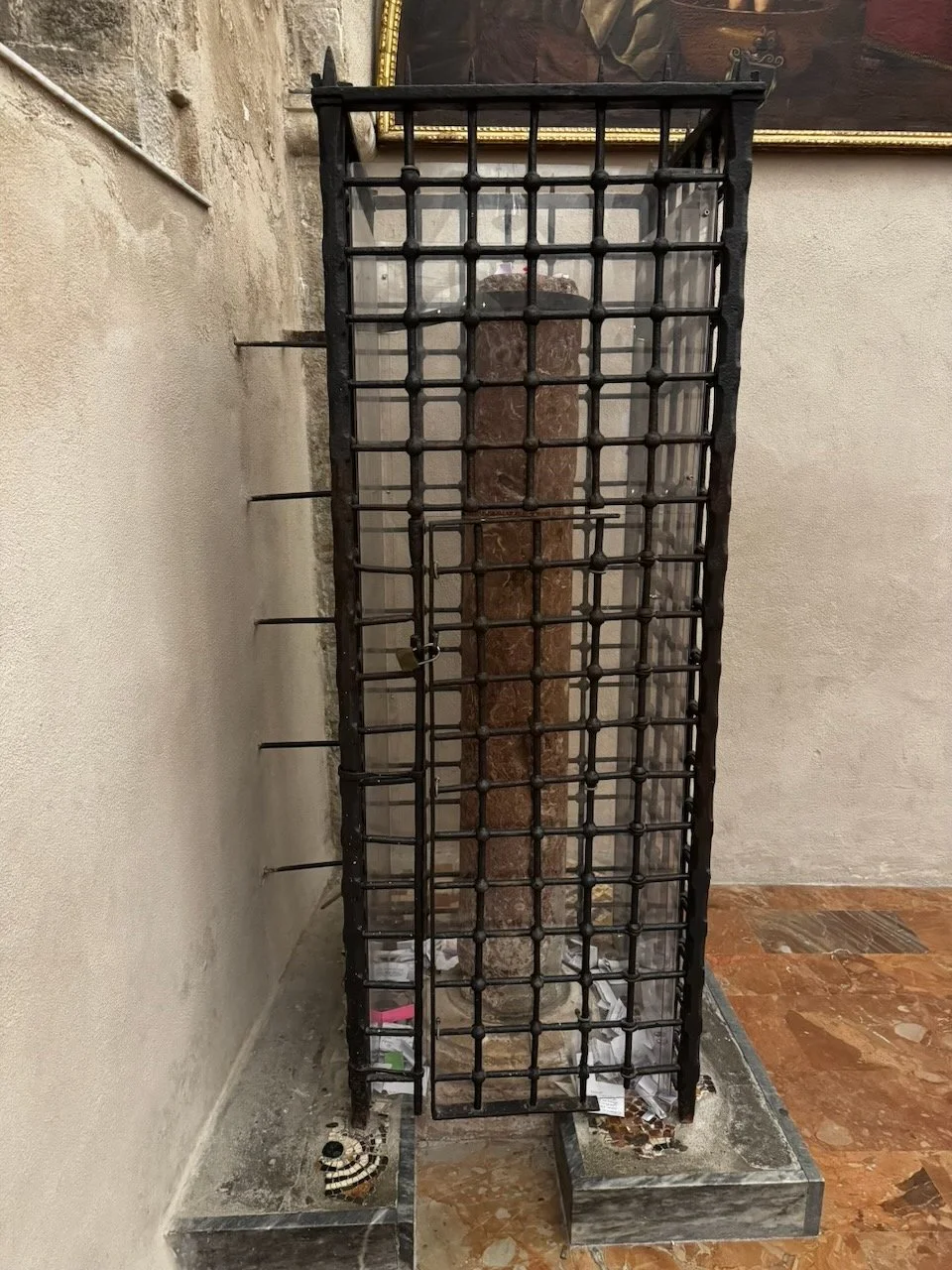For centuries, the pillar has been considered miraculous. Traditionally, young unmarried women (nubili) would walk around the pillar three times, touching or praying to it, and would quickly find a husband.. The column was originally part of the colonnade surrounding the tomb but was moved to this corner in the 19th century. Because of its popularity and the damage caused by pilgrims touching it—as well as some small pieces breaking off—the pillar is now protected by a grate.