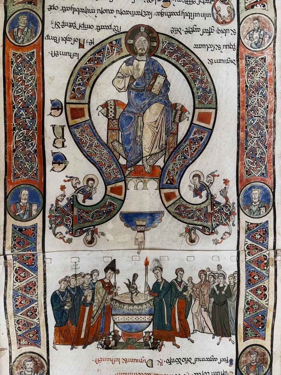 The scrolls are referred to as “illuminated” because they are decorated with hand-drawn embellishments. These images are inverted to allow the congregation to view them as the deacon reads the music and intones the liturgical chant during the Easter Vigil. Each liturgical scroll is an exquisitely detailed work of Southern Italian Medieval art, made between the 10th and 12th century CE.