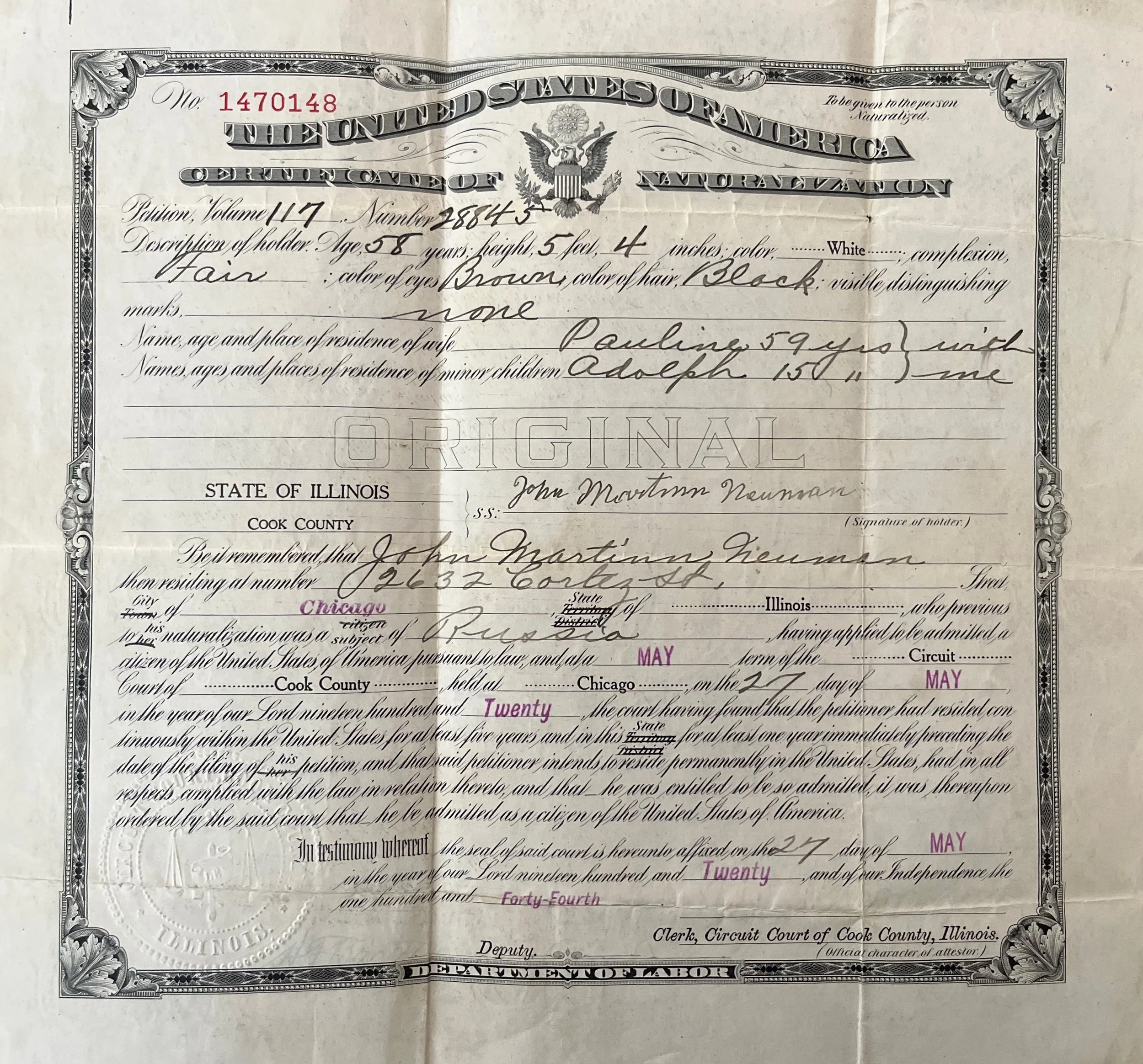 13. The voyage of only 6 of the 11 family members is known. John, Martin, and Emil departed from Libau, Latvia aboard the SS Birma and arrived in the Port of New York on August 30, 1911. From there they entered Ontario, Canada, and then finally settled in Chicago, Illinois on December 31, 1911. Roughly a year later, on October 31, 1912, Pauline, Karl, and Adolph (8 years old) departed from Rotterdam, Netherlands aboard the SS Volturno and arrived in Port of Halifax, Nova Scotia, Canada on November 11, 1912. They then joined the rest of the family in Chicago, Illinois. This is the Naturalization form for Pauline and Adolph dated May 27, 1920, 8 years following their arrival. The family lived at 2632 Cortez St in 1920.