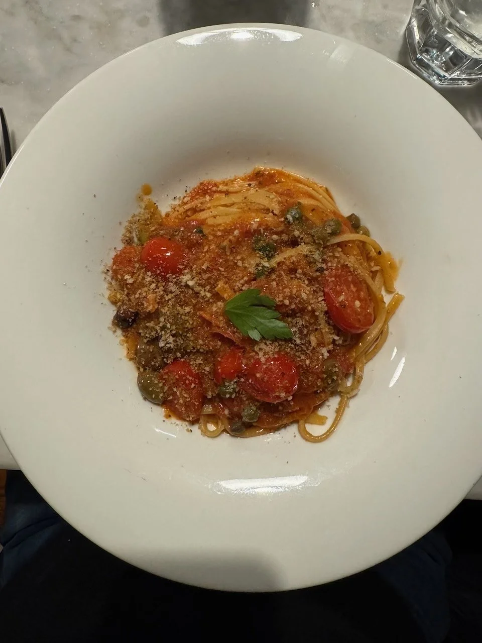 For dinner I had Linguine Di Martino, Salina capers, Gaeta black olives, oregano, and cherry tomatoes from Mount Vesuvius. Deliziosa!