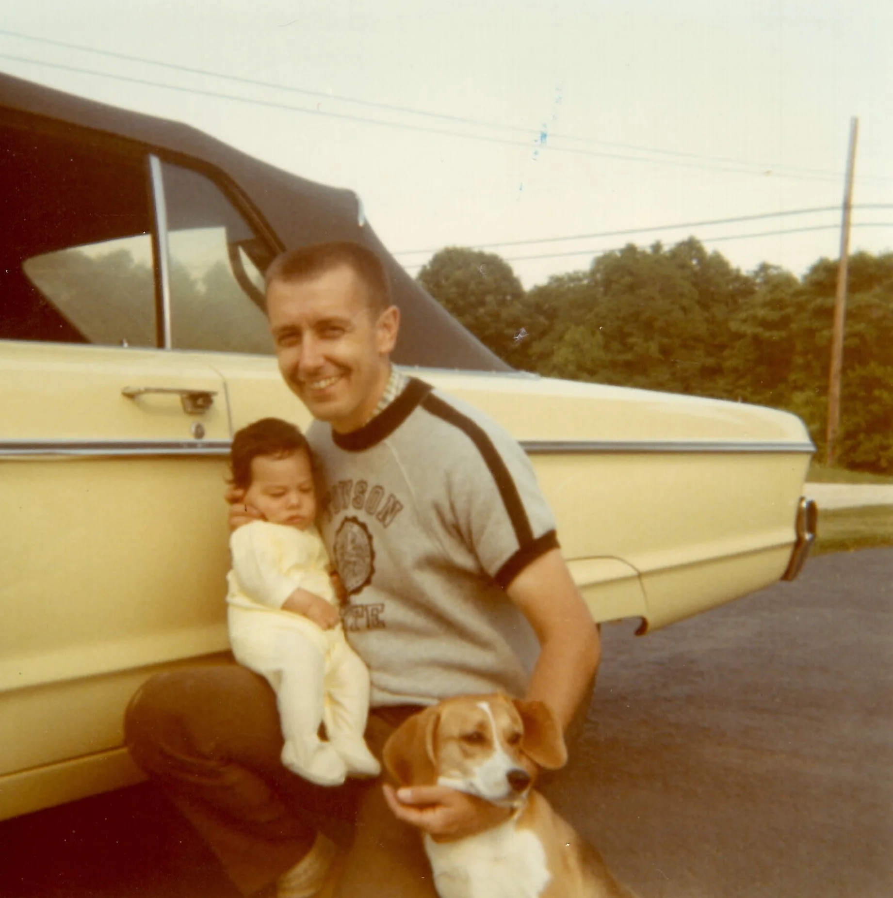 45. Brooks Buick opened in the early 1930s on Mt Royal Ave in Baltimore, before moving to Towson. The owner of the dealership had kids enrolled in First Lutheran School and he bought his wife a new car every year. Probably in 1968, he made a very good offer to Jim and Ruth on the wife’s one-year-old 1966 Plymouth Fury III convertible, and Ruth rid herself of the ugly Rambler. This photo of Steve (approx. 3 months), Jim, and Beagle Holly is beside the relatively new Plymouth in the driveway of Pat and Mildred’s house in Kingsville, MD. This photo was probably taken in early June 1970 shortly before Jim, Ruth, Steve, and Ruth’s parents flew to meet family in CA and interview with Clyde Showalter.