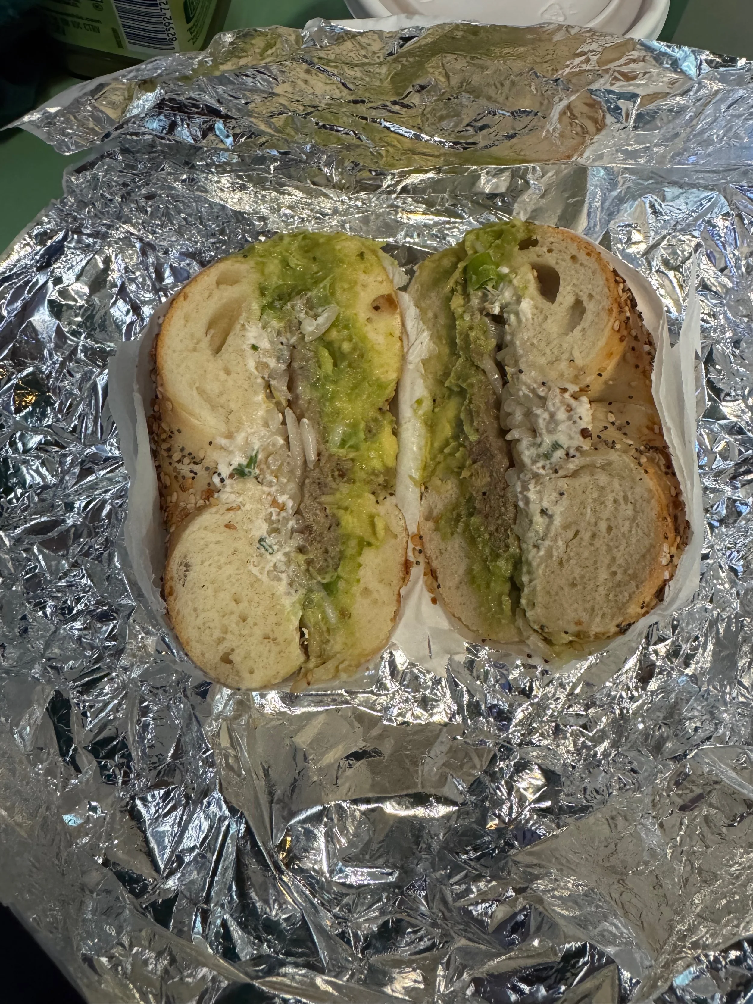 Steve had The Salino—Beyond meat, avocado, tofu scallion spread & sprouts on an everything bagel. Amazing!