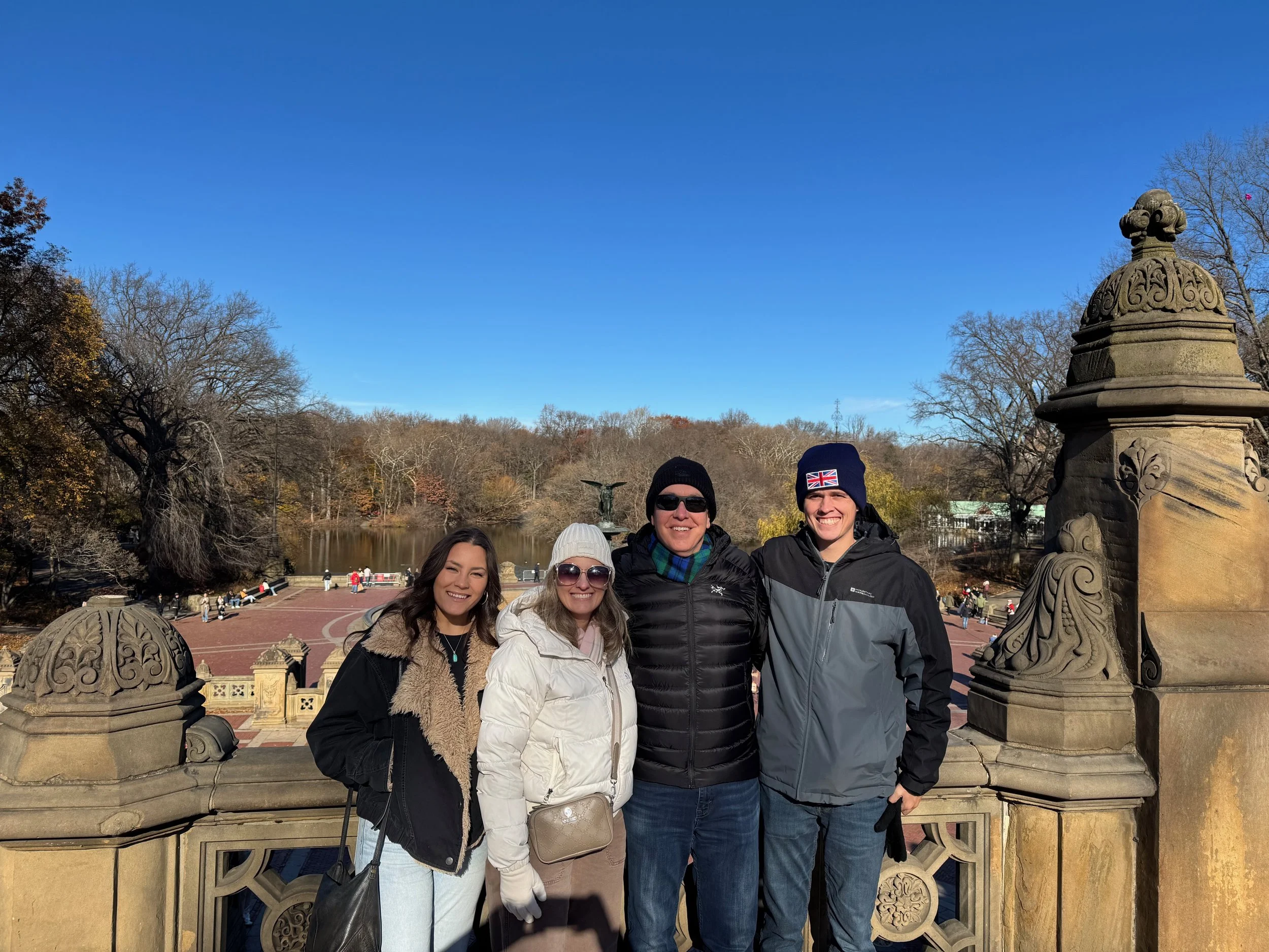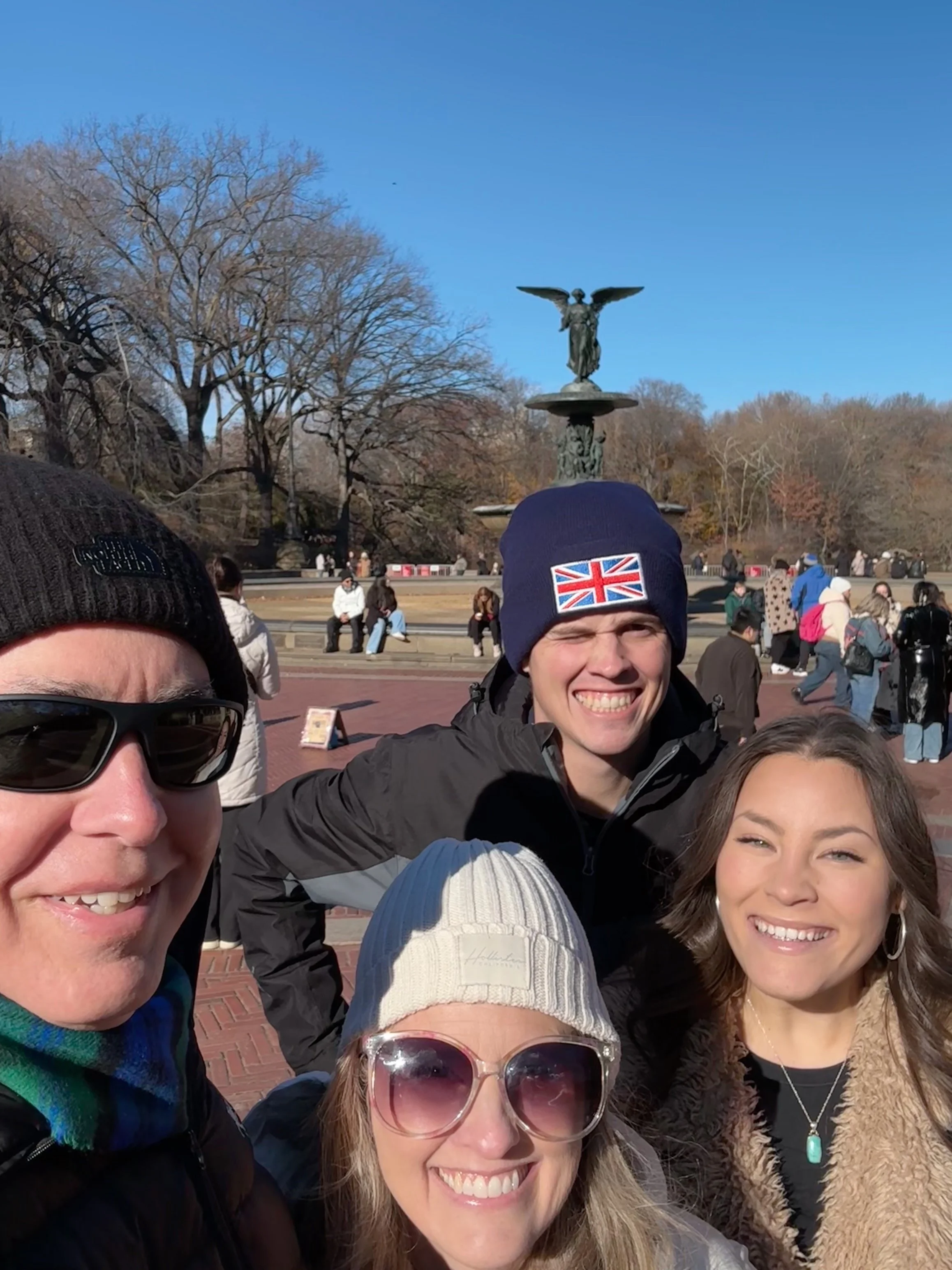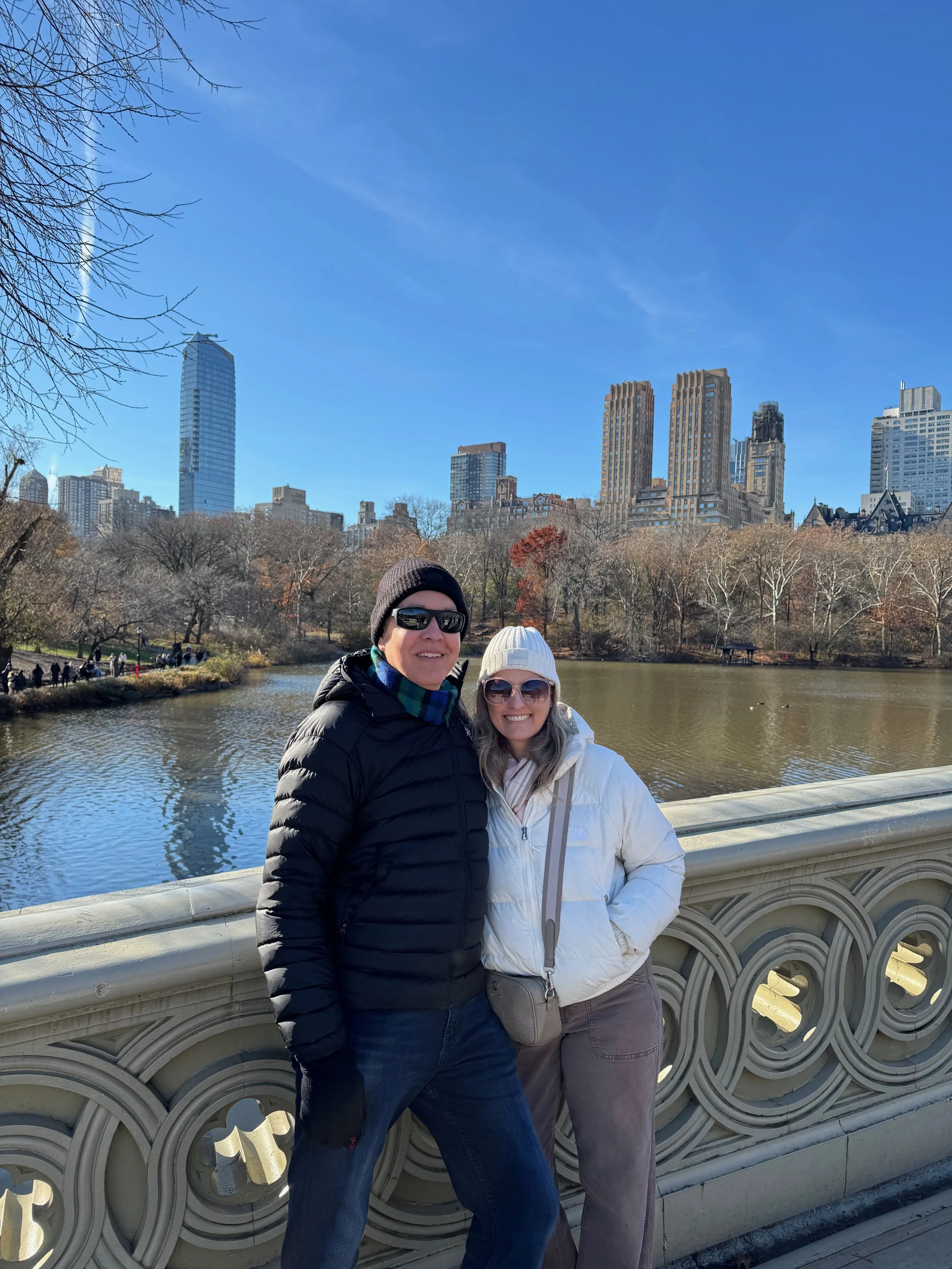 In Central Park standing on Bethesda Terrace with the Bethesda Fountain behind us.
