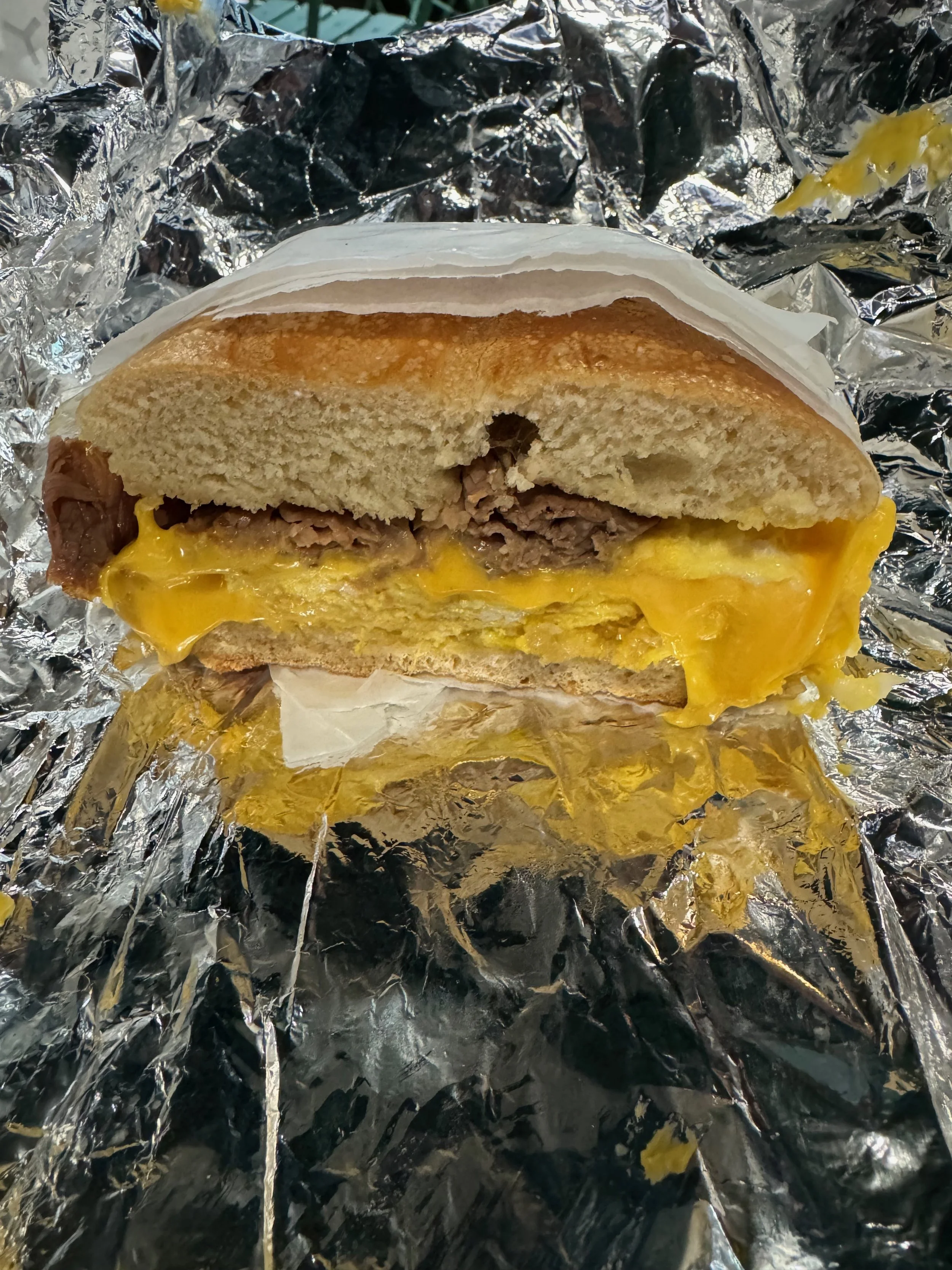 Will had the Chuck D—Sirloin, egg & American cheese on a plain bagel.