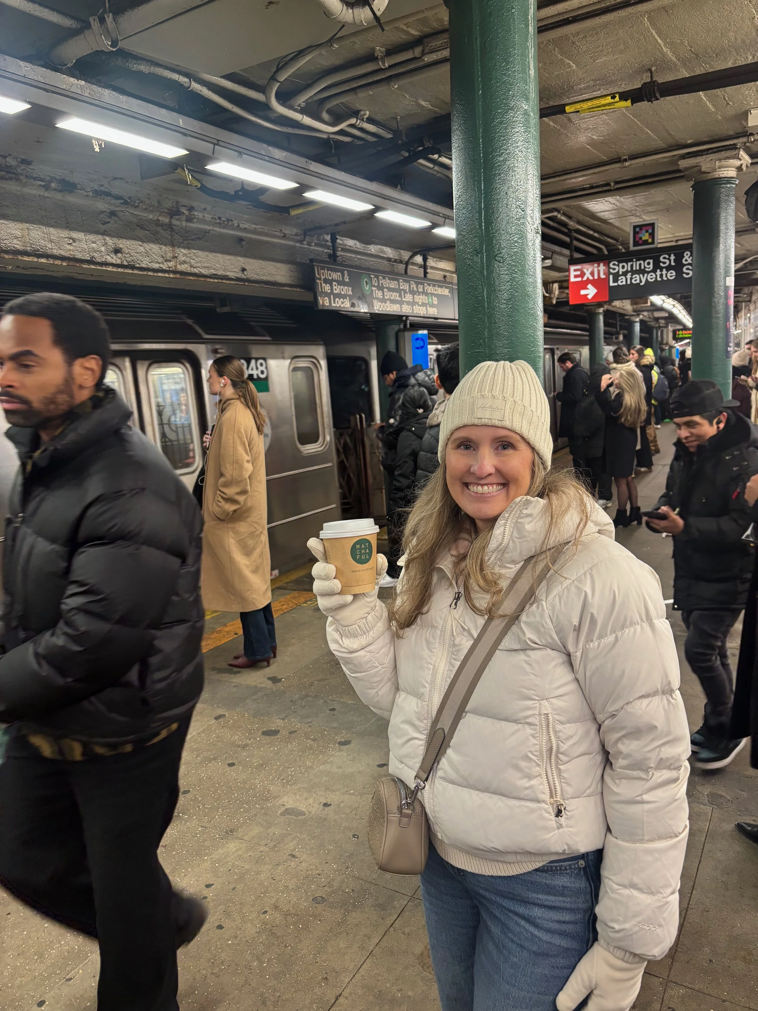 Amanda was craving her own warm Winter Special Mindful Mint matcha. Here she is inside the Spring St subway station on our way to dinner.