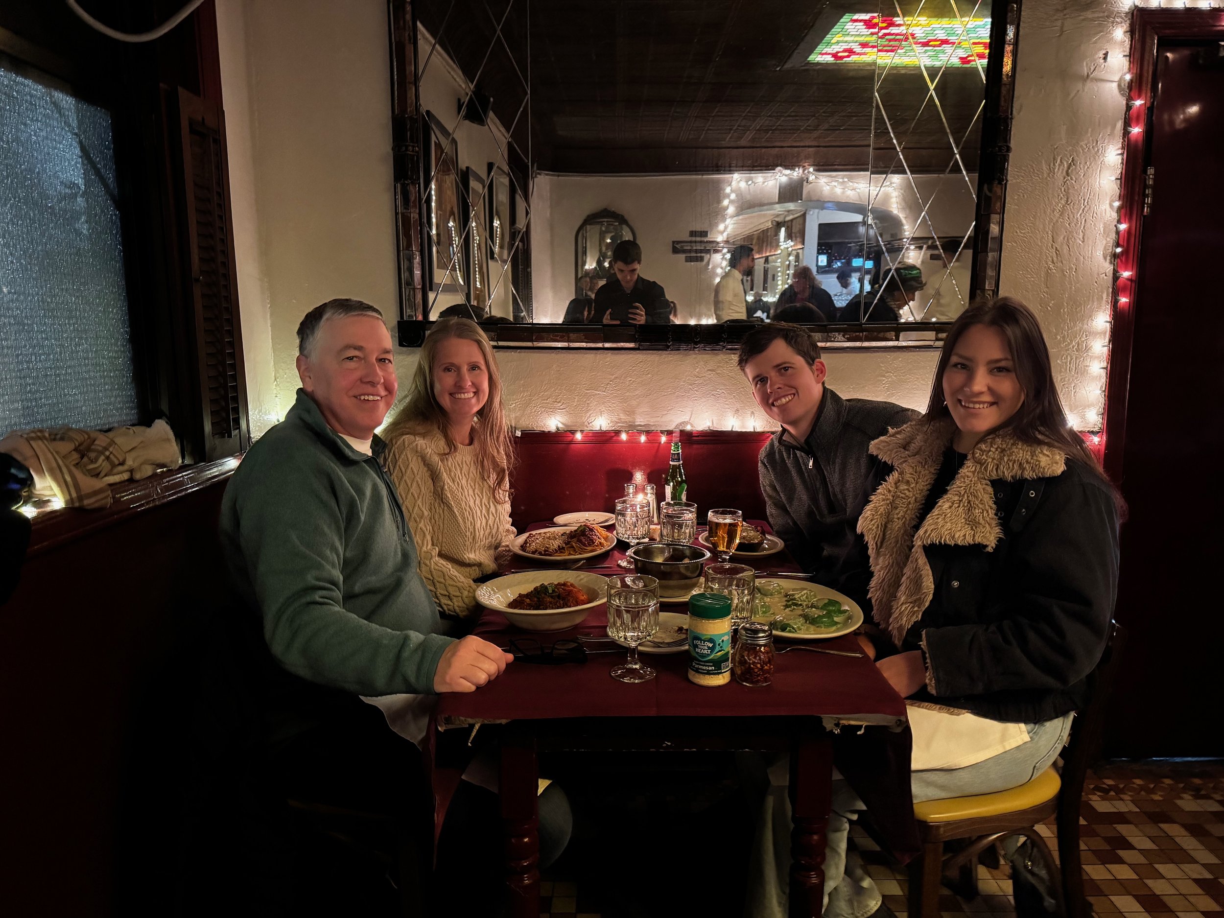With almost an hour to spare before our ice-skating reservation, escaping the cold at Connolly’s Irish Pub (121 W 45th St) was irresistible. Here’s Will showing off his new Yankees cap and a Christmas present for Lauren.