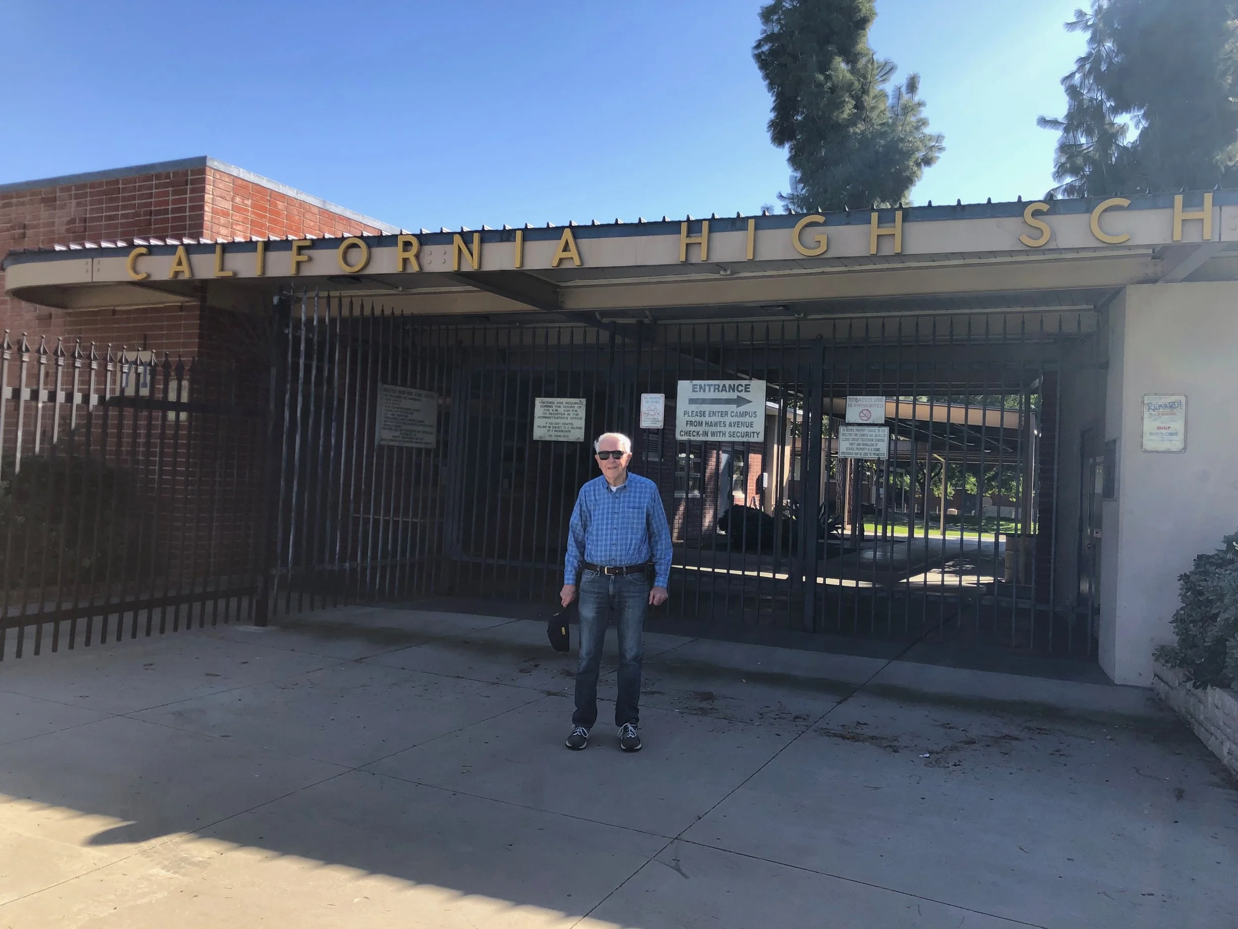74. Jim in front of California High School, Whittier, in November 2021, roughly 64 years after graduating.