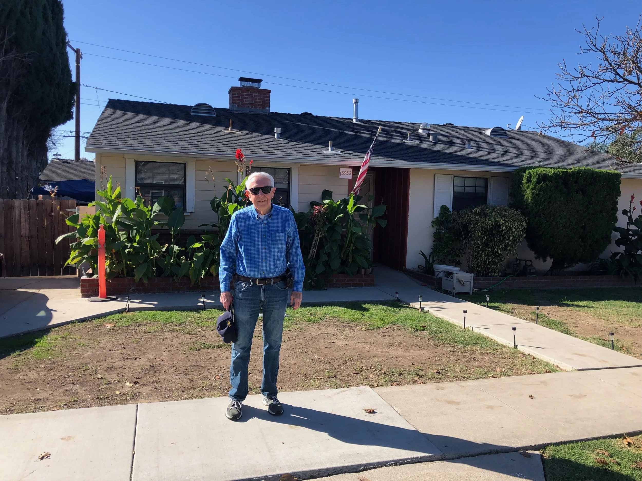 73. Jim in front of 13932 (formerly 1224) Dittmar Dr in November 2021, roughly 64 years after he left the house to attend college. The front elevation, side driveway (of car and truck washing fame), and rear garage remain recognizable.