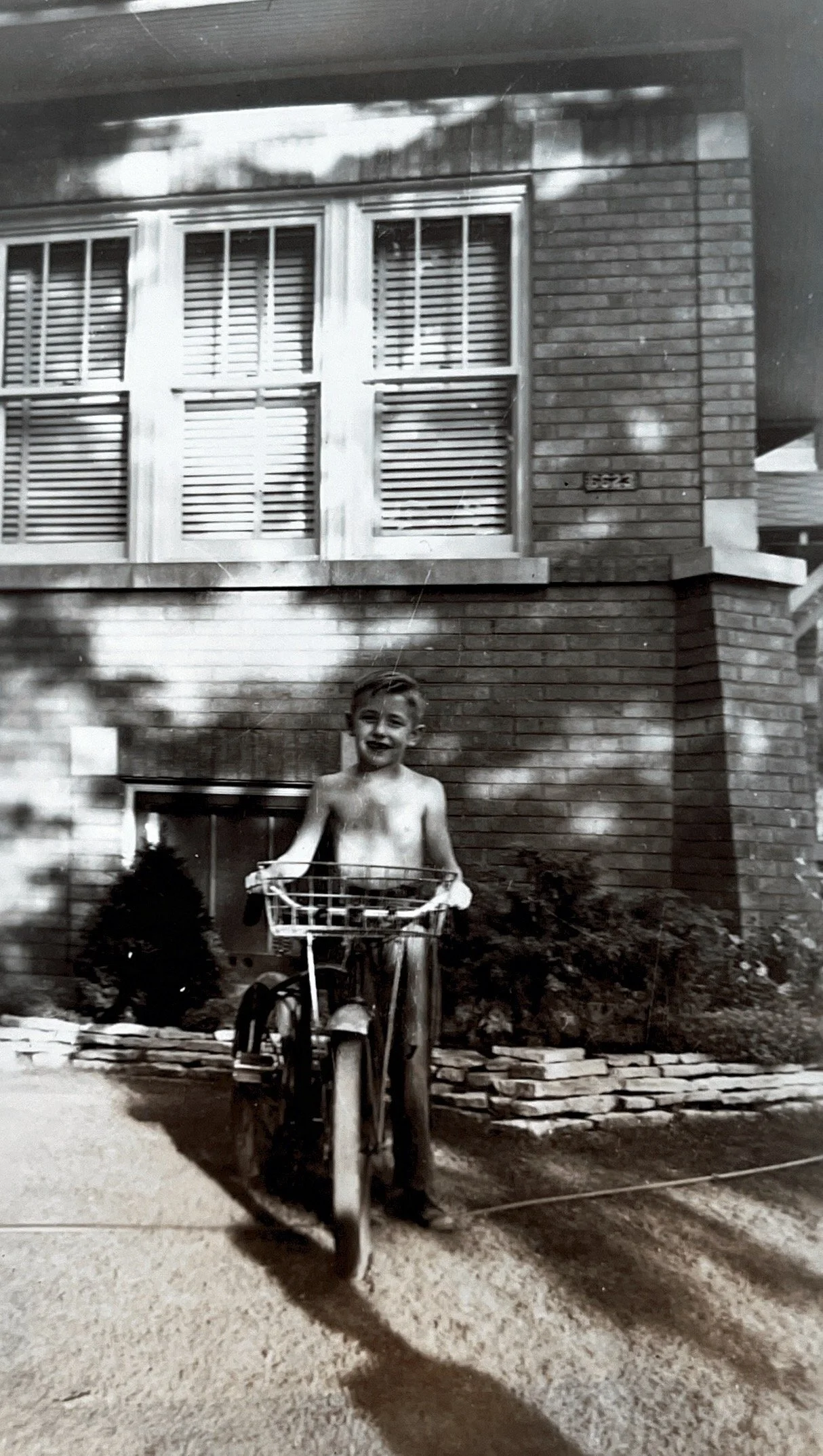 32. Jim and his bicycle in front of the Oliphant house, the address of 6623 is visible.