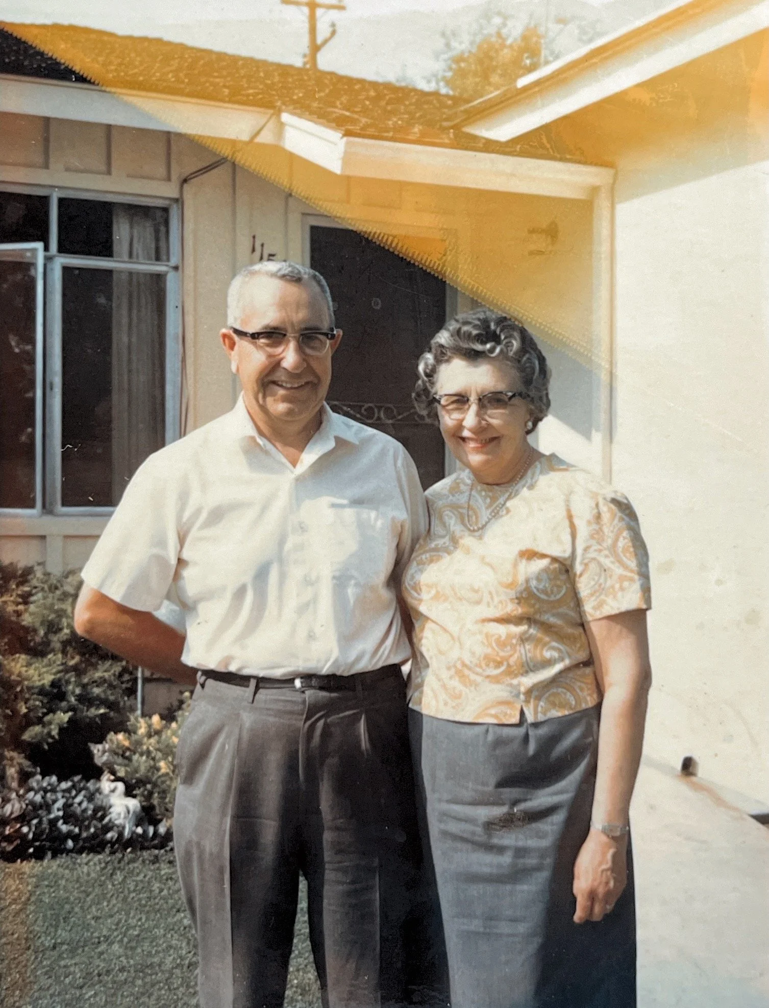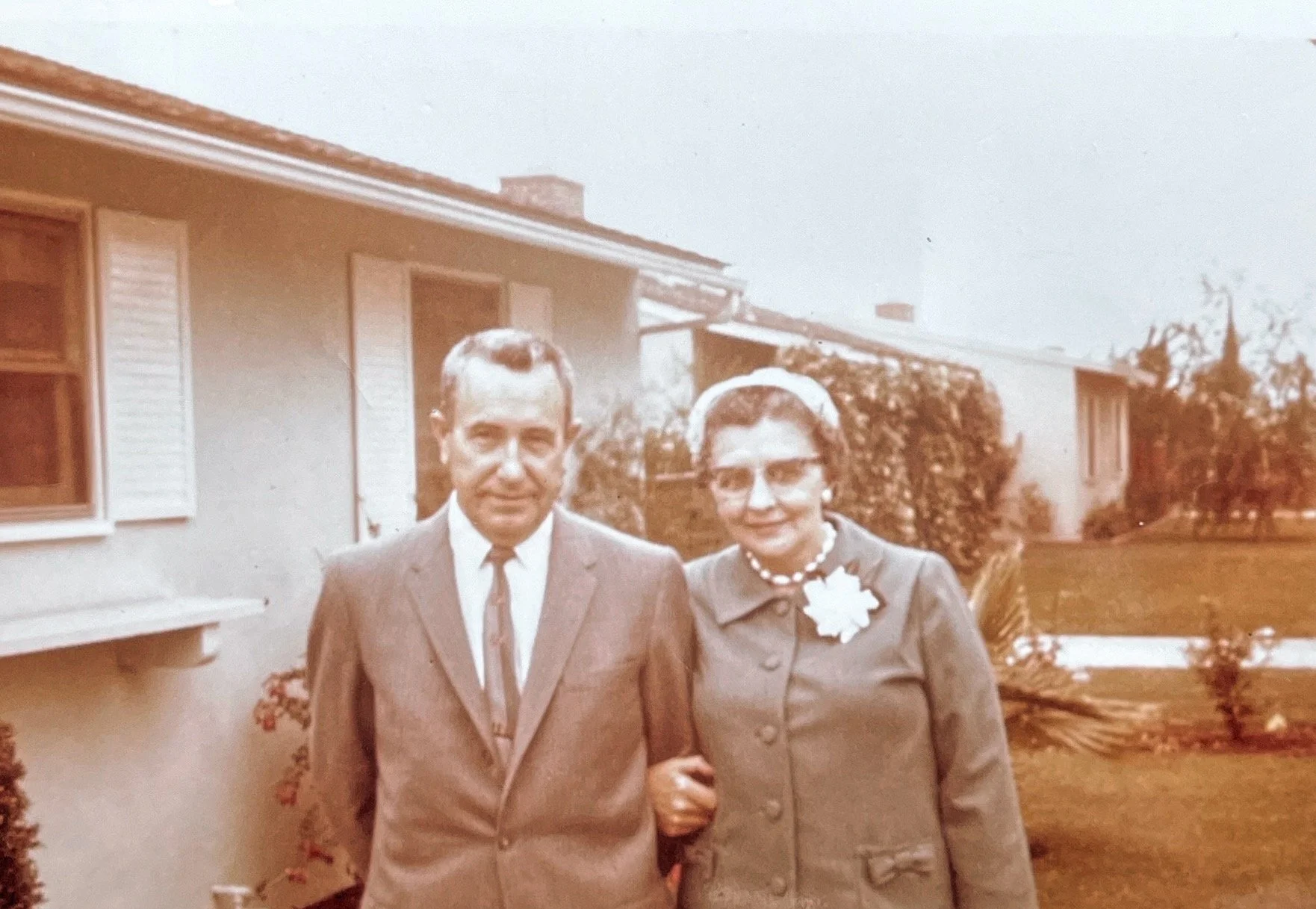 10. On May 7, 1977, following dinner at Fiddler’s Three restaurant, Adolph and Mildred arriving at Jim & Ruth’s Tustin home to continue the 50th anniversary celebrations.