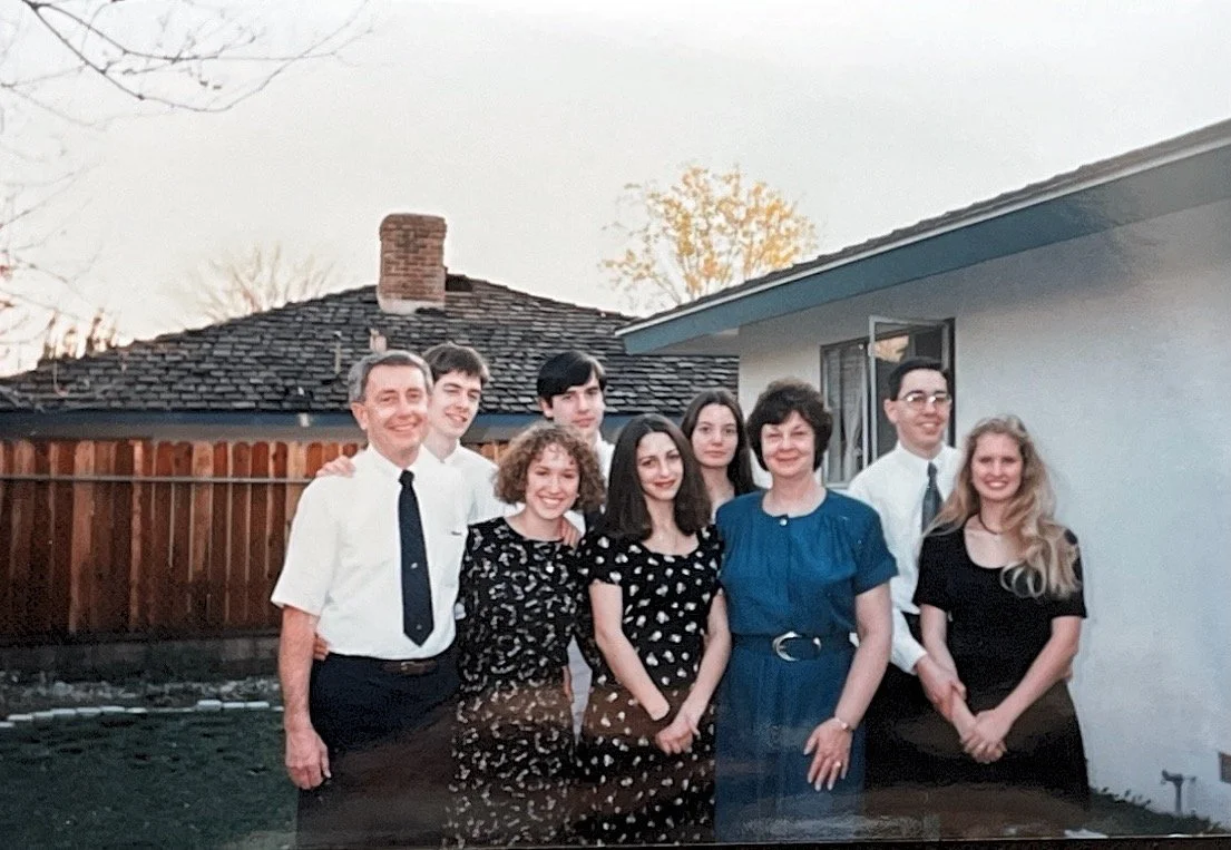 25. Family photo during a visit by Bob and Dorothy to the Camarillo house in October 1995. Behind the couch: Jim, Bob, & Don. On couch: Breanne, Dave, Debbie, Amanda (1 month pregnant with Matt), Steve, Dorothy, Tim, and Jean.