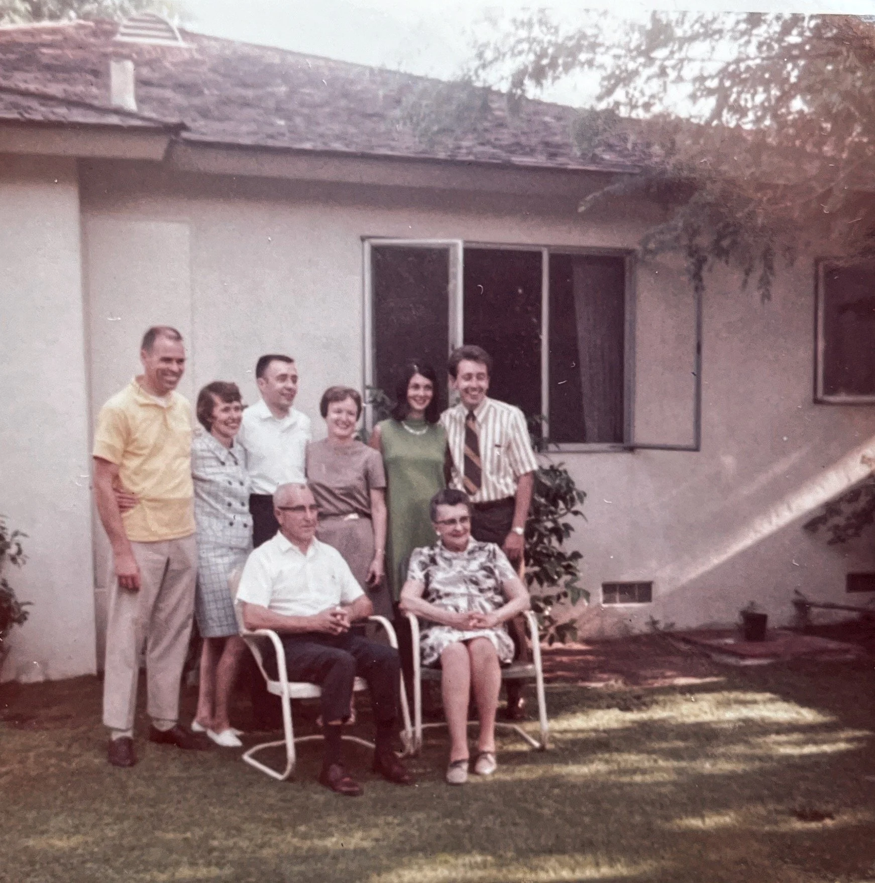 6. On the same occasion as Photo 5: Don, Jean, Bob, Dorothy, Ruth, and Jim with Adolph and Mildred in the backyard at Jean and Don’s house.