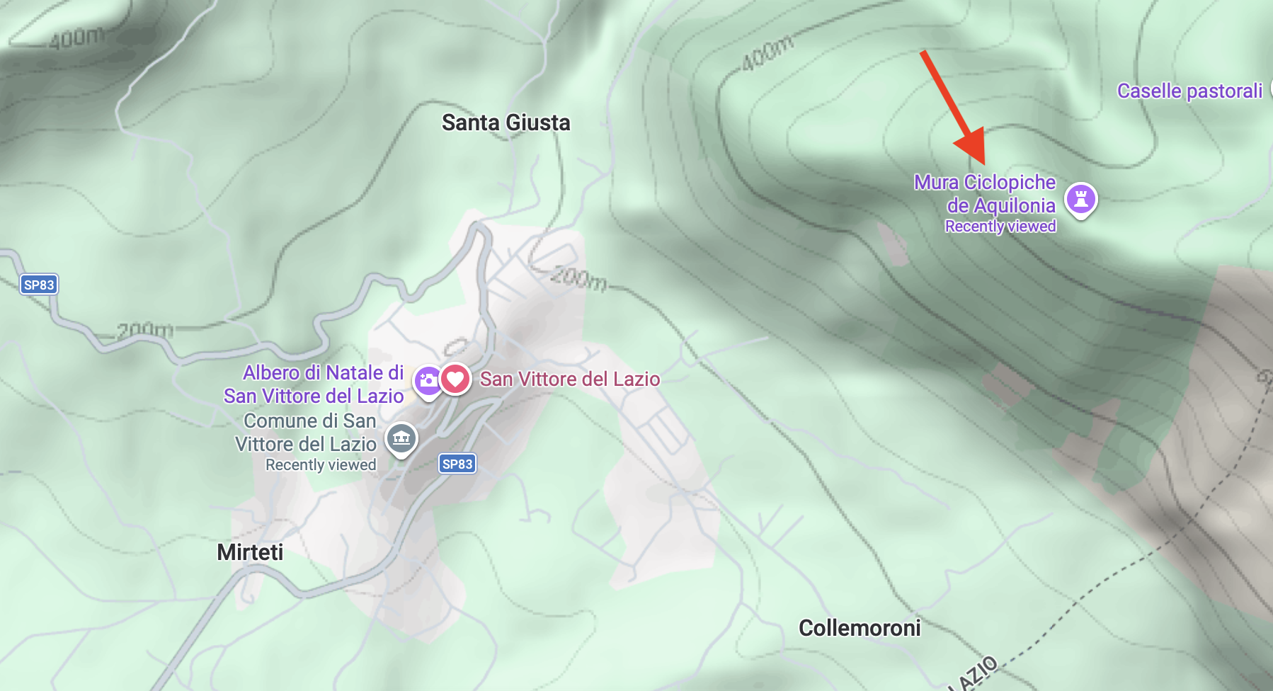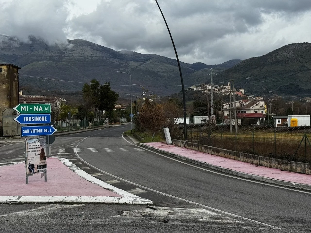 This is the "San Vittore del L" exit from the traffic circle on the Autostrada A1—the main highway between Rome and Naples. The ruined walls of Aquilonia still crown the hilltop to the right, overlooking the village of San Vittore del Lazio on its promontory.