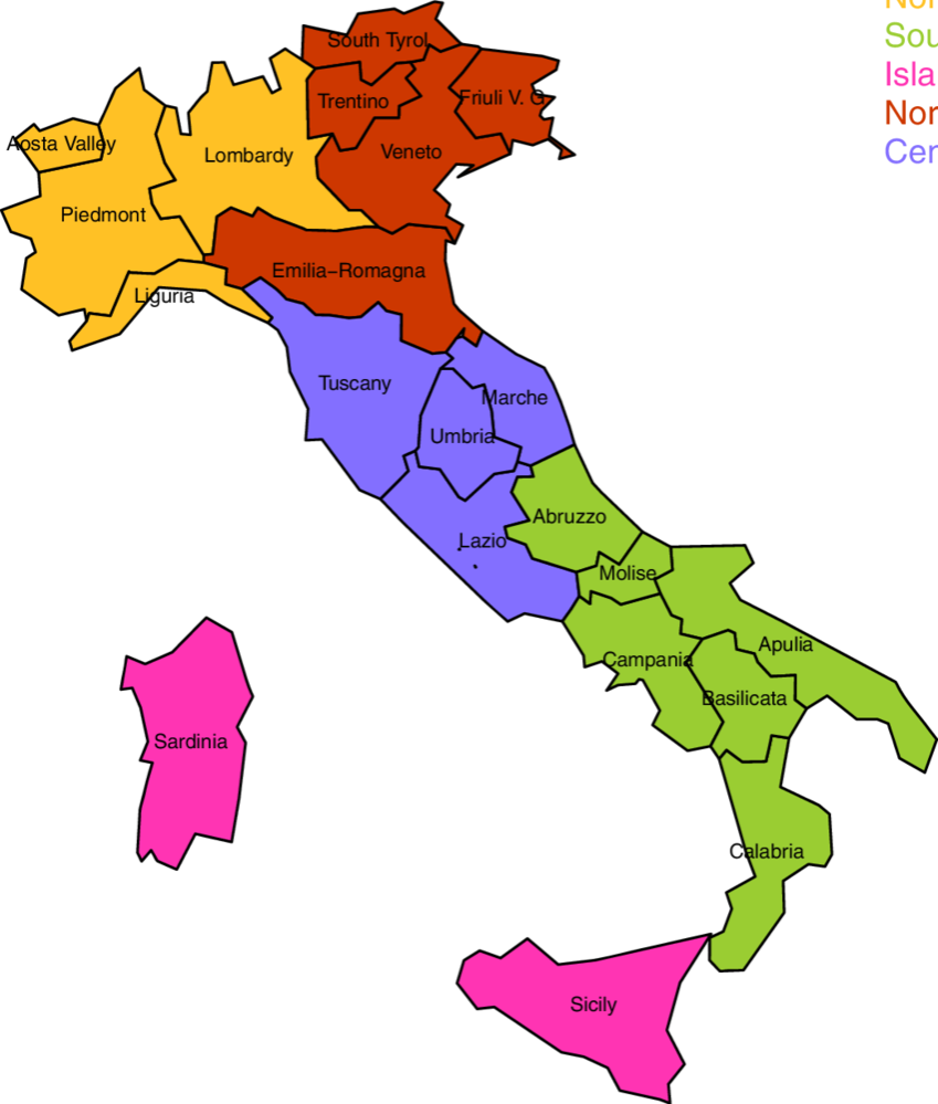 Italy is divided into five geographical areas: North-West, North-East, Centre, South, and Islands. Italy is further divided into 20 regions, with the Lazio Region being in Central Italy. San Vittore del Lazio translates as Saint Victor of the Lazio Region.