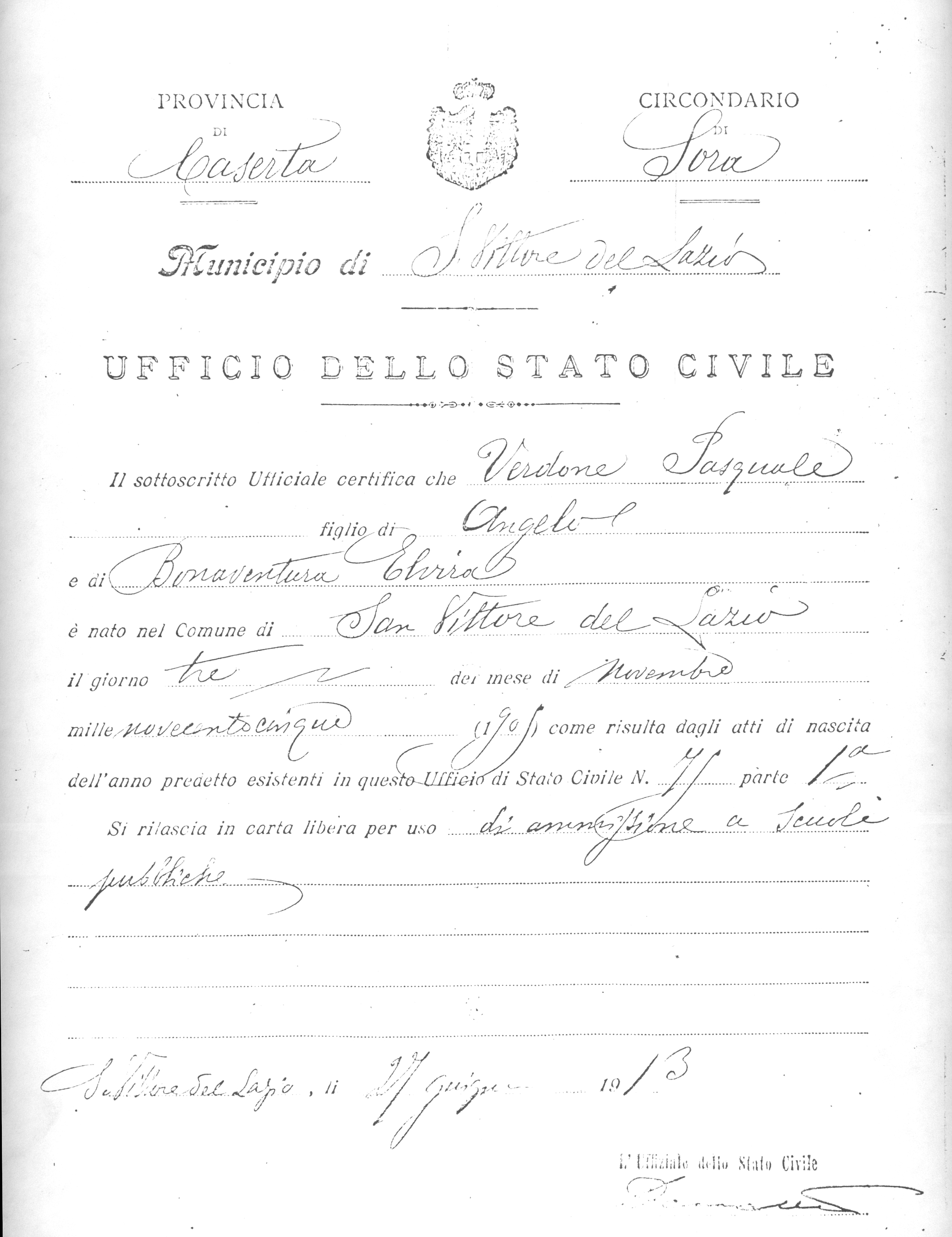 Italian birth certificate for Pasquale Verdone, born to Angelo and Elvira (née Bonaventura) on November 3, 1905, in San Vittore del Lazio. Pasquale later Anglicized his name to Patrick (Pat).