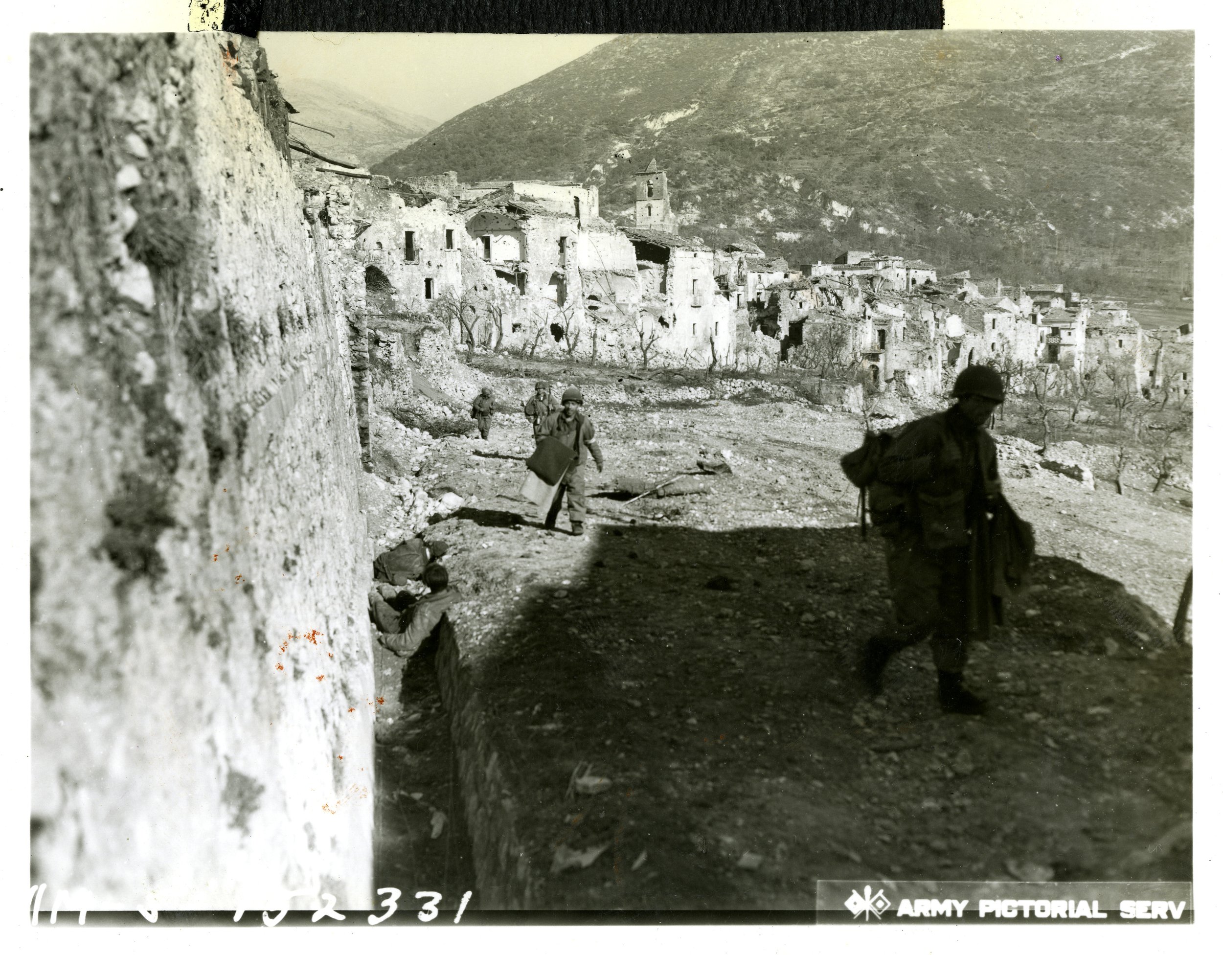 San Vittore del Lazio was liberated on January 6, 1944. Here, on January 9, weary American infantrymen enter the village, now quiet with desolation and death after three nightmarish days of ceaseless shelling and bombing preceding its capture. The two-tone spire of Chiesa di San Nicola is visible in the distance. For its wartime ordeal San Vittore received the Silver Medal for Civil Valor in 2004.
