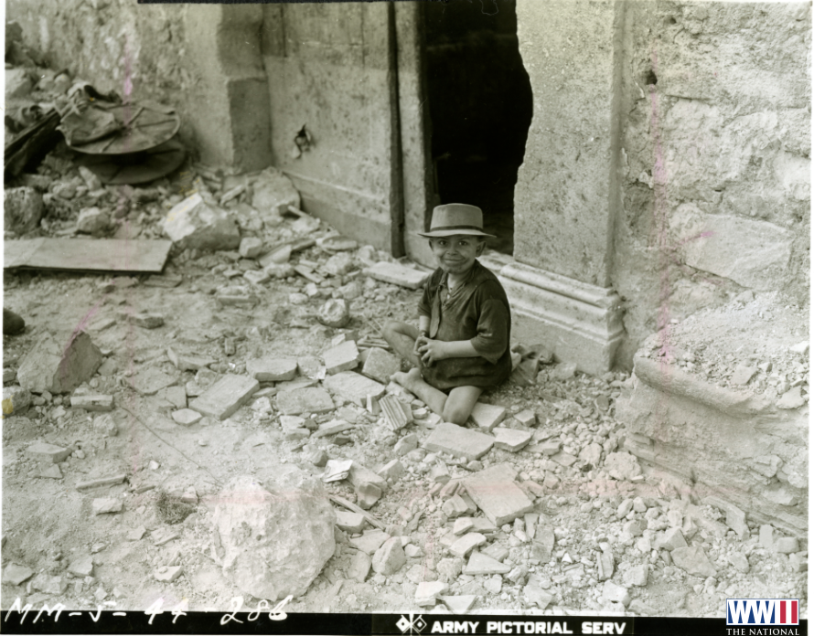 Allied forces advanced toward the town in early January 1944. Heavy Allied bombings and fierce house-to-house combat to dislodge German forces, lead to high civilian casualties. Here a child plays in the rubble of San Vittore del Lazio.