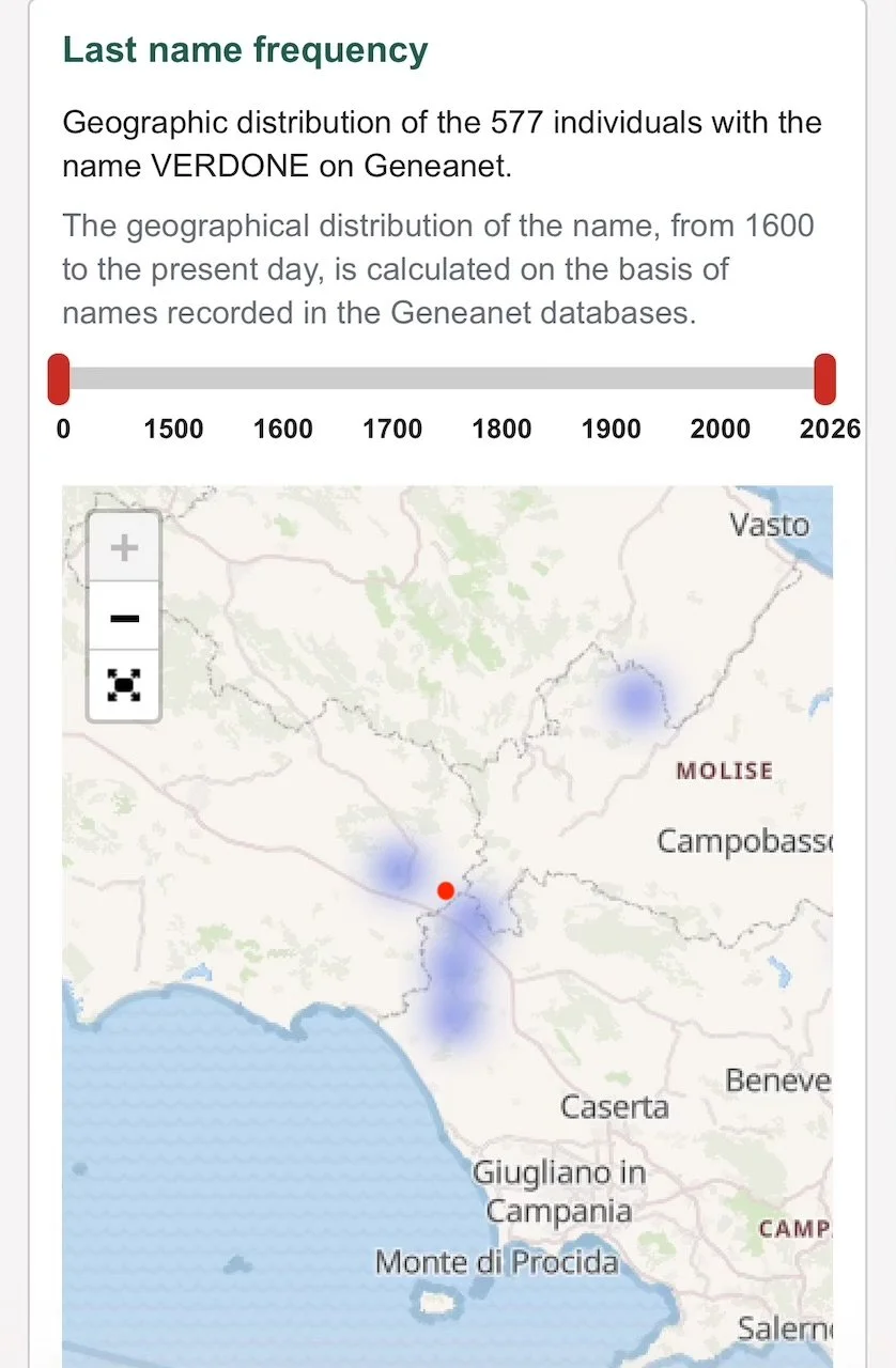 From the town hall they learned Verdone was not a surname directly connected with San Vittore. The red dot shows San Vittore with surrounding clusters of the surname Verdone. From this it seems likely Angelo Verdone was a neighbor to Elvira Bonaventura, who lived in San Vittore del Lazio.