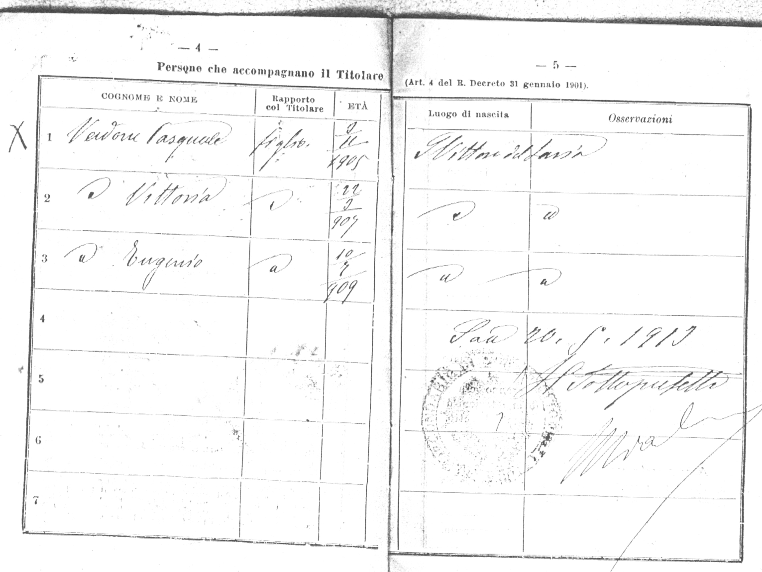 As was often the case, Angelo moved to America first to establish financial security. Elvira followed with the three children in tow, each occupying an entry on her passport, their places of birth all listed as San Vittore del Lazio. The arrival date stamped upon entry is September 20, 1913. Frank was born in the US on January 1, 1916.