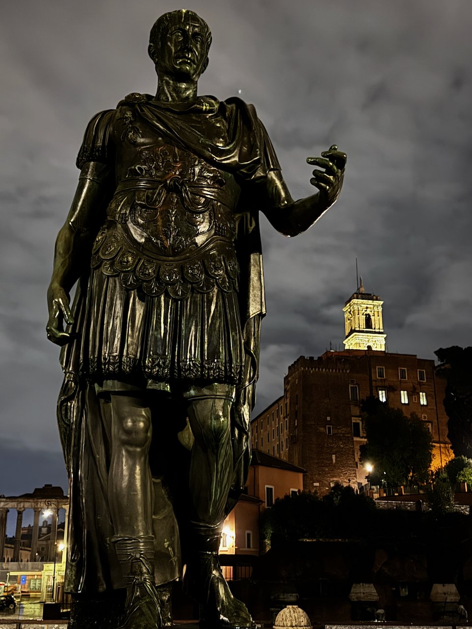Statue of Julius Caesar with the bell tower of the Senatorial Palace in the distance.