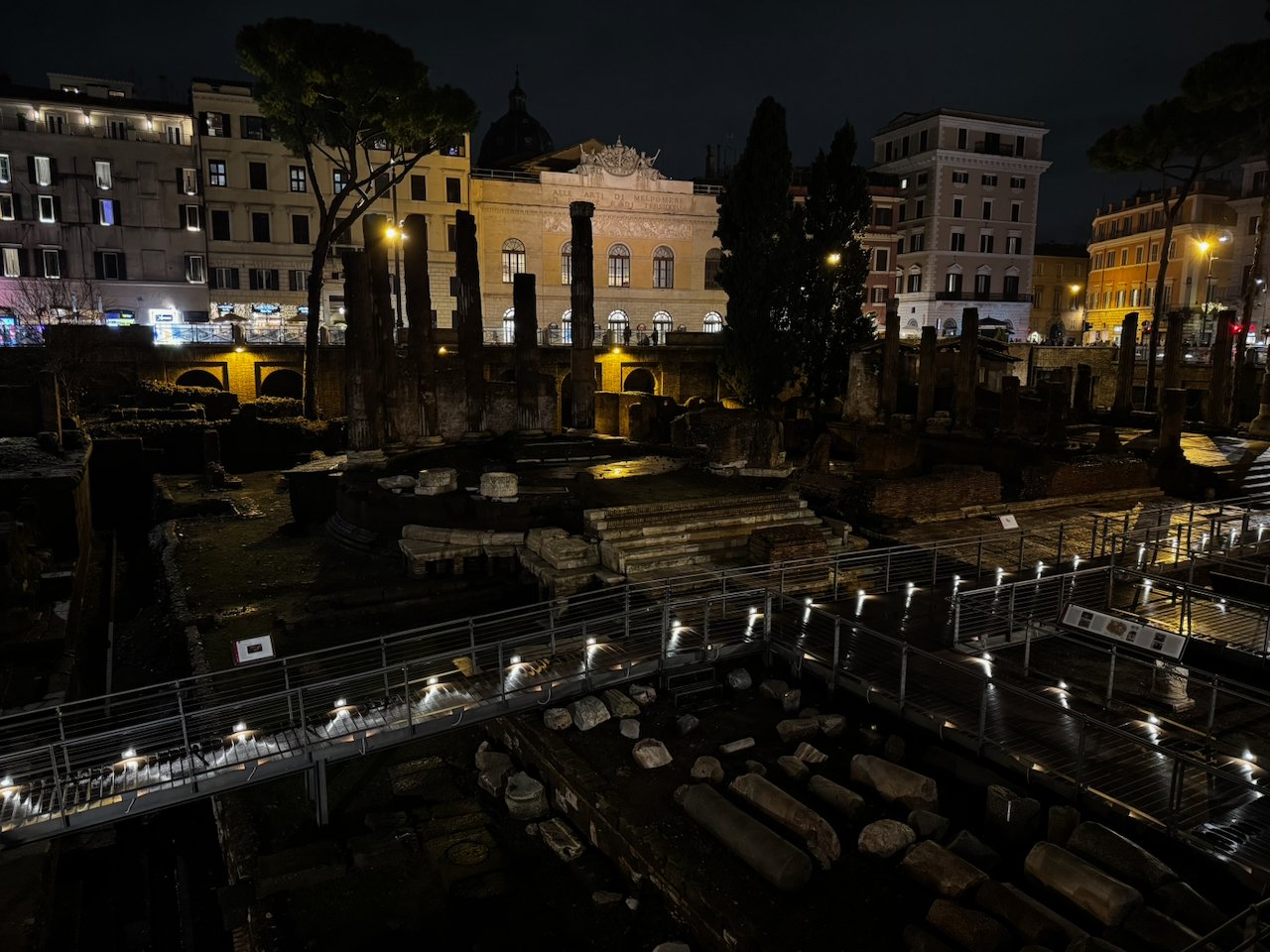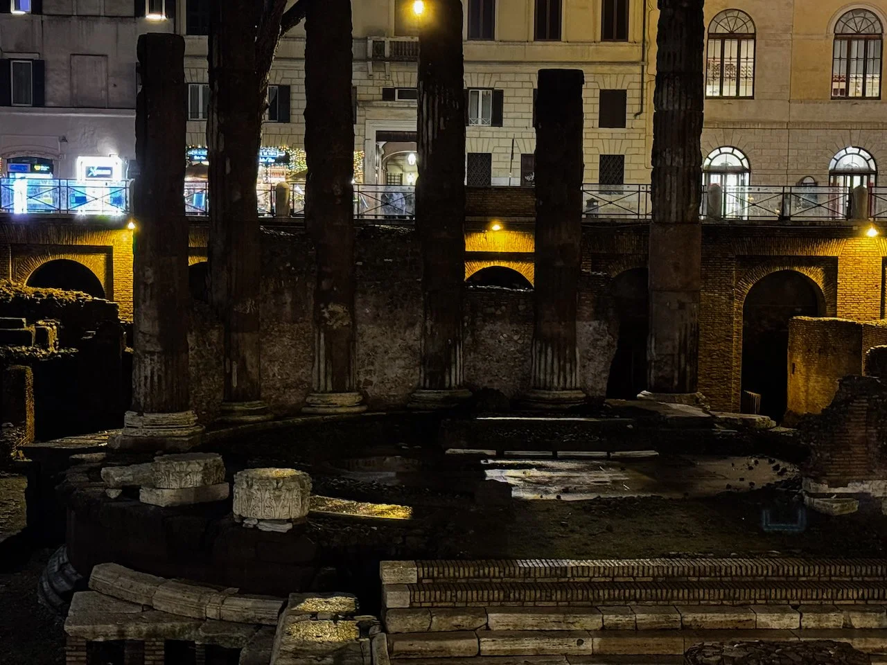 Dave booked us a great nighttime walking tour that began here at the Largo de Torre Argentina sunken square, which includes the ruins of the Curia of Pompey, marked by the tall columns.