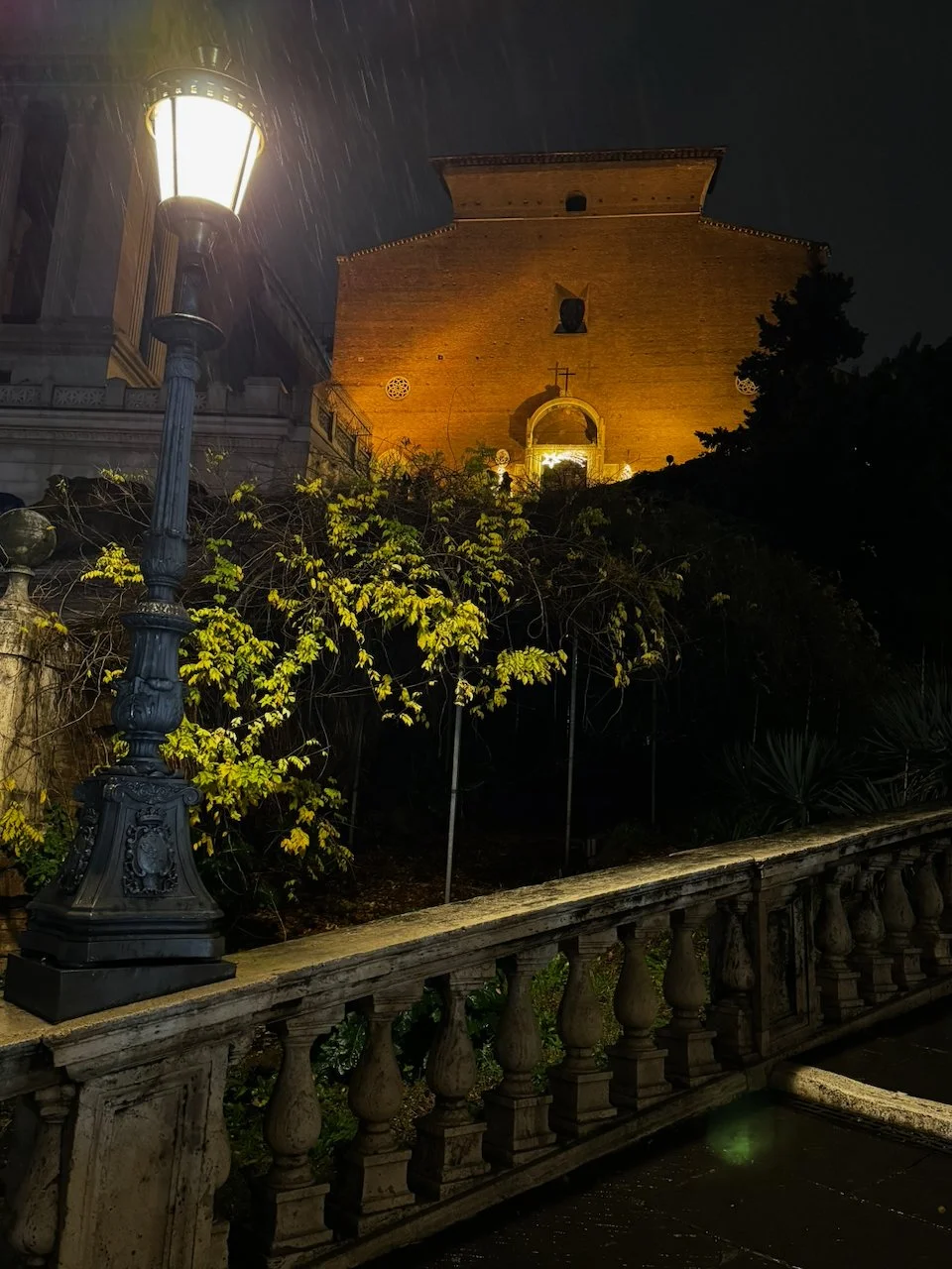 The rain coming down as the group surveys the Monument to Victor Emmanuel II (left) and Santa Maria in Aracoeli Basilica (right).