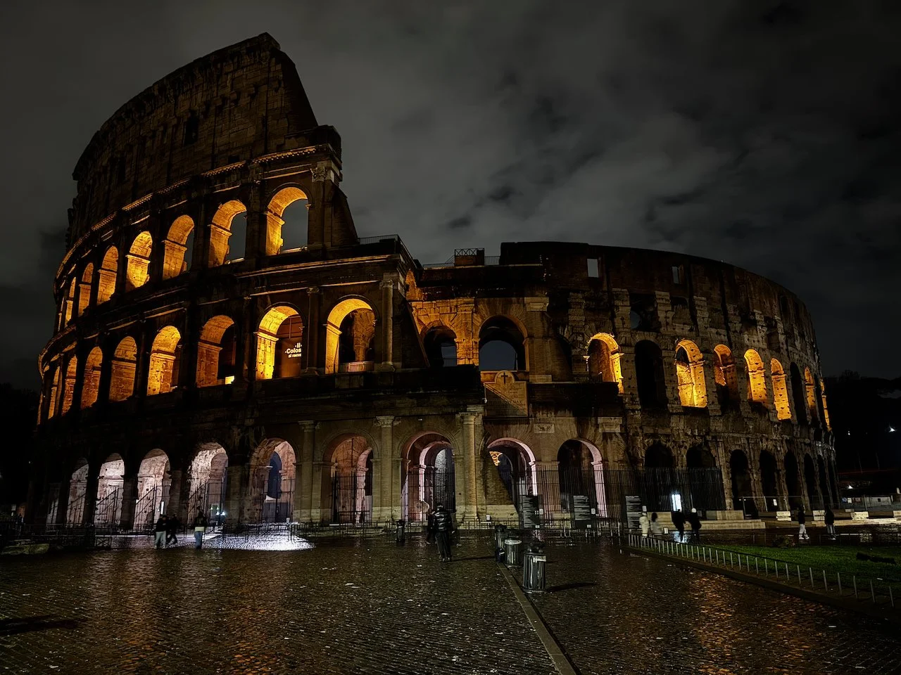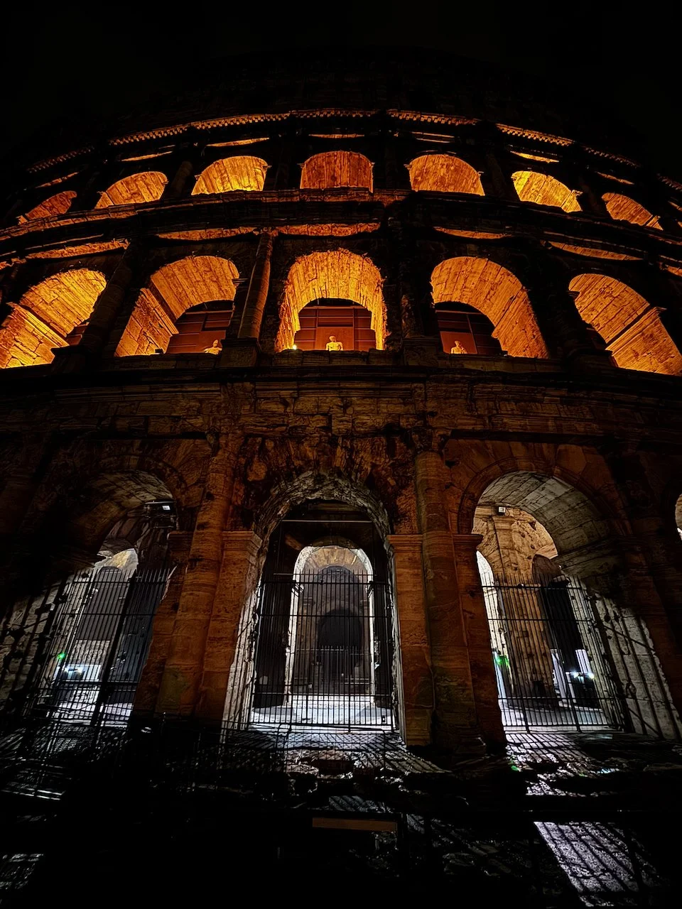 Illuminated after dark, the Colosseum takes on a dramatic presence.