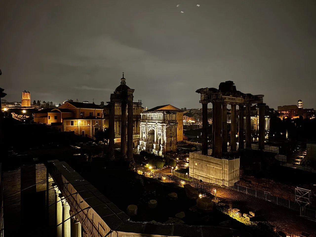 Overlooking the Roman Forum, a vast field of ancient temples and civic buildings, and the Palatine Hill, once the site of imperial palaces.