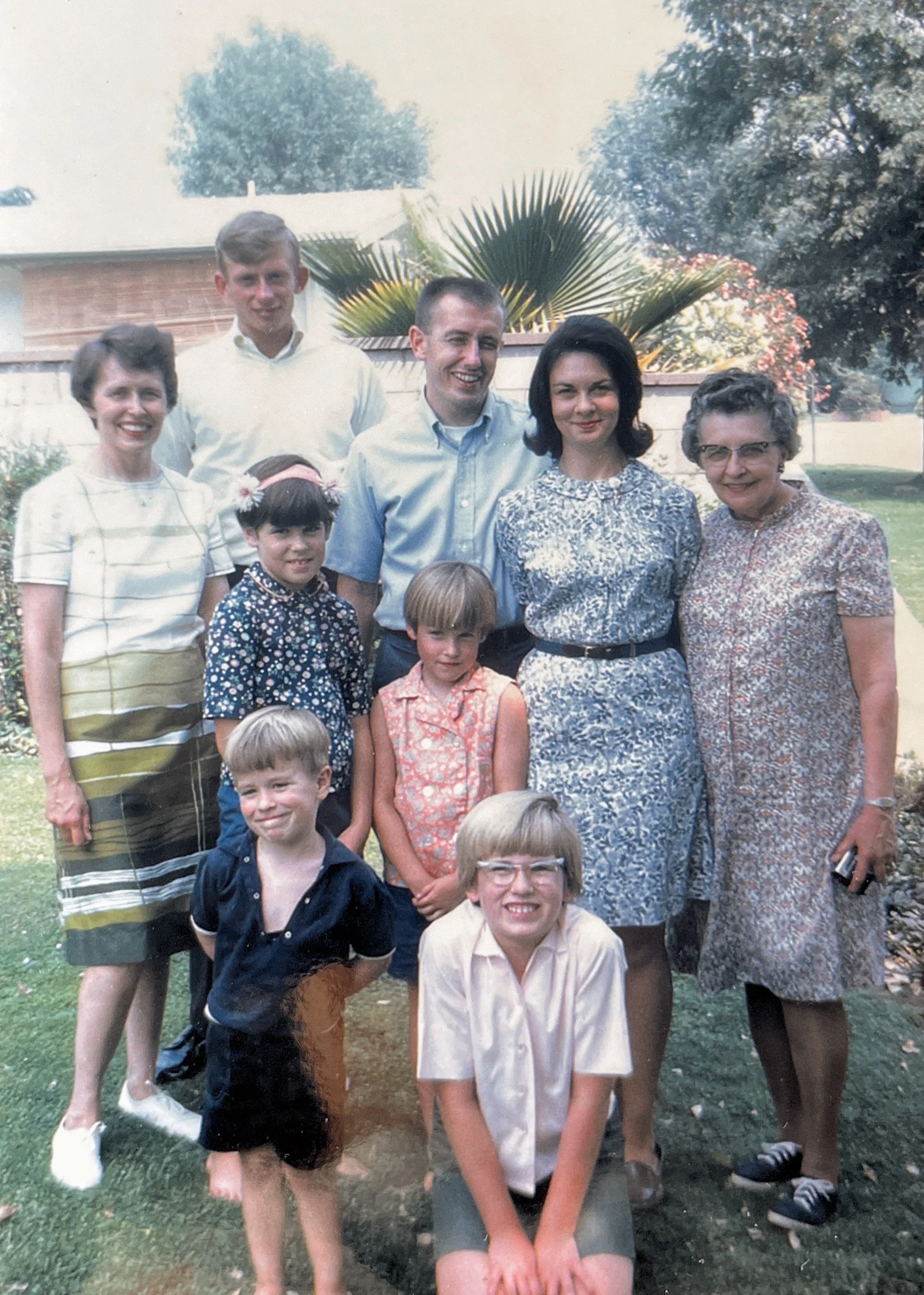 3. Following their cross-country honeymoon journey in the summer of 1964, Jim and Run made another cross-country trek during the summer of 1969. This trip took them up into Canada and to Niagara Falls, where the river had been blocked and the falls were not flowing. This photo was taken at the halfway point, in front of Don and Jean’s house in Glendora, CA. Back: Jean, Jean & Jim’s first cousin John Desmedt, Jim, Ruth, and Mildred. Middle: Susan and Karen. Front: John and Cheryl. John Desmedt was the son of Mildred’s sister Elenore. He was a U.S. Secret Service Agent for the Carters.