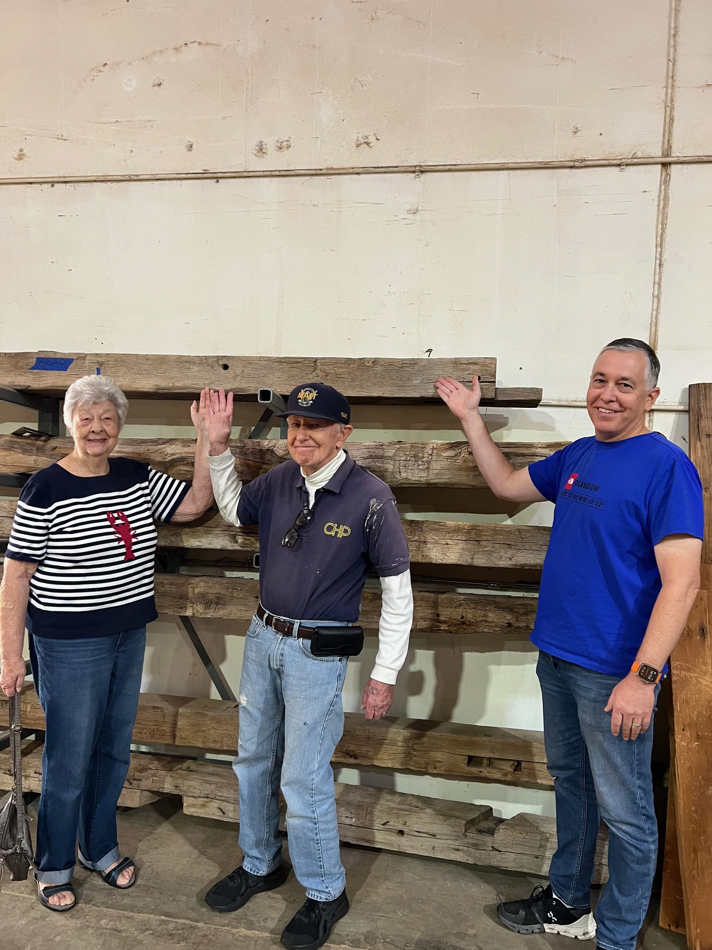 71. Ruth, Jim, and Steve pick out a piece of characterful reclaimed lumber at 805 Woodworks to create a mantel for the Camarillo house in November 2023.