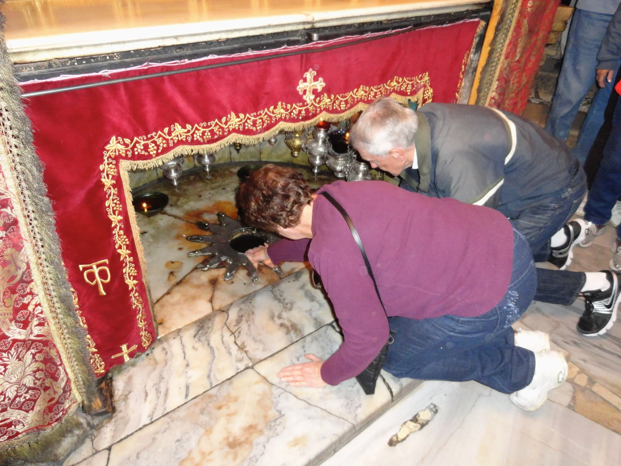 30. Ruth and Jim kneel at the Grotto of the Nativity, believed to be the place of Christ’s birth, inside the Church of the Nativity in Bethlehem, West Bank, Palestine.