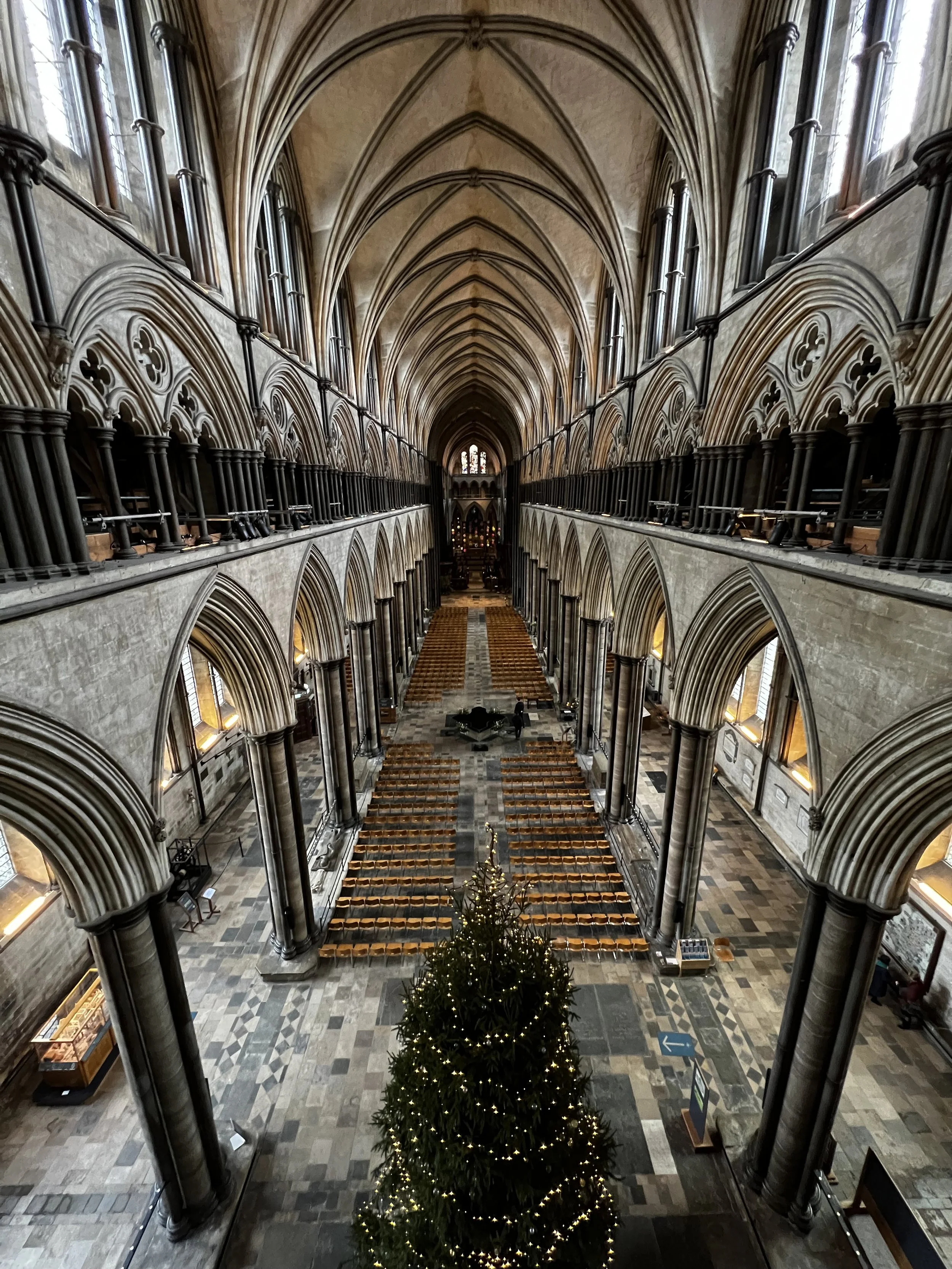 The third reason I love Salisbury Cathedral so much: it is one of the few cathedrals where you are permitted to travel up inside the the upper reaches of the building. Will looking down at the Nave from the Triforium.