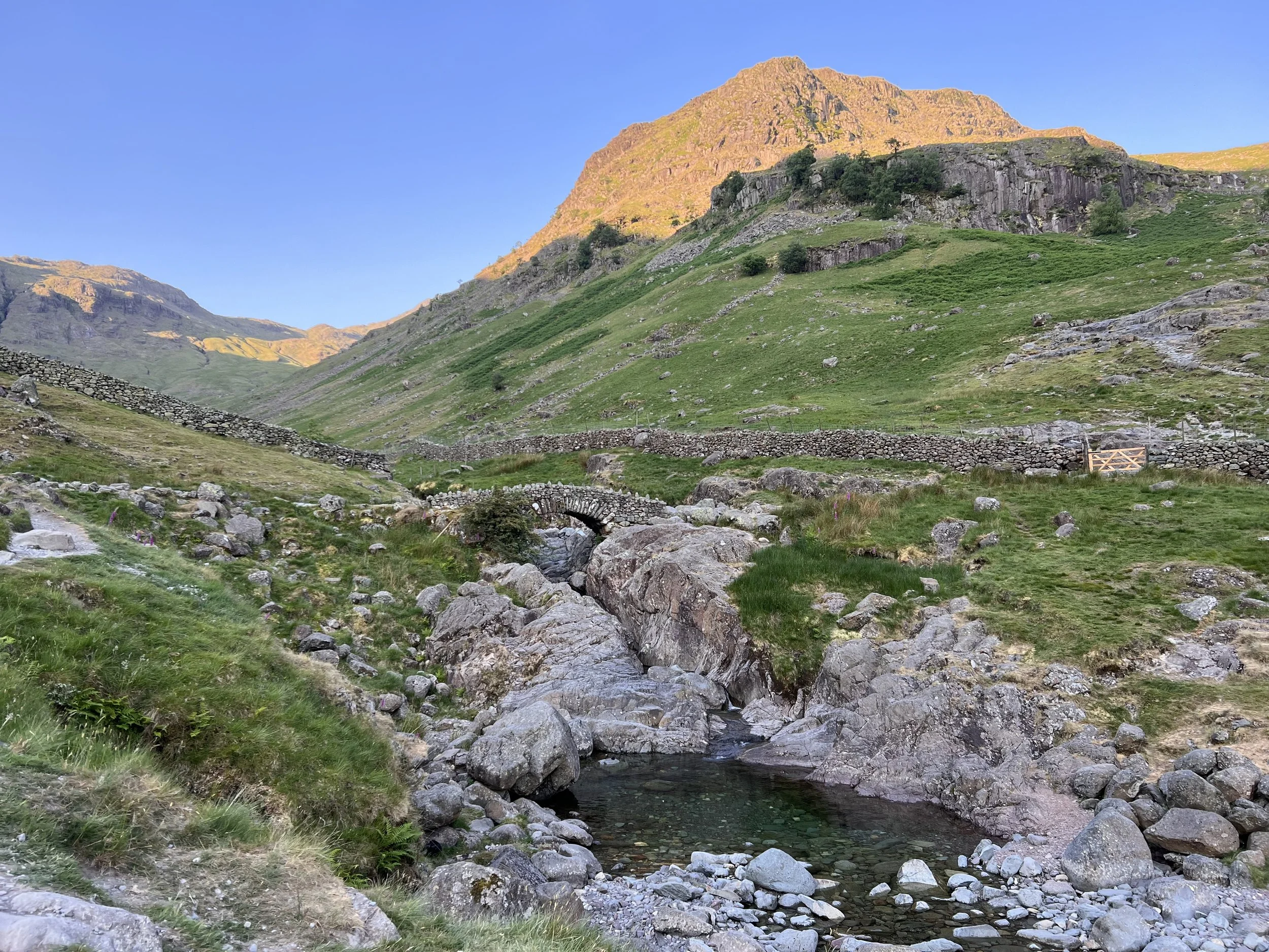 Through the gate I turn left and follow the path up the gill to the left of Seathwaite Fell—known as The Scafell Pike Walk Route.
