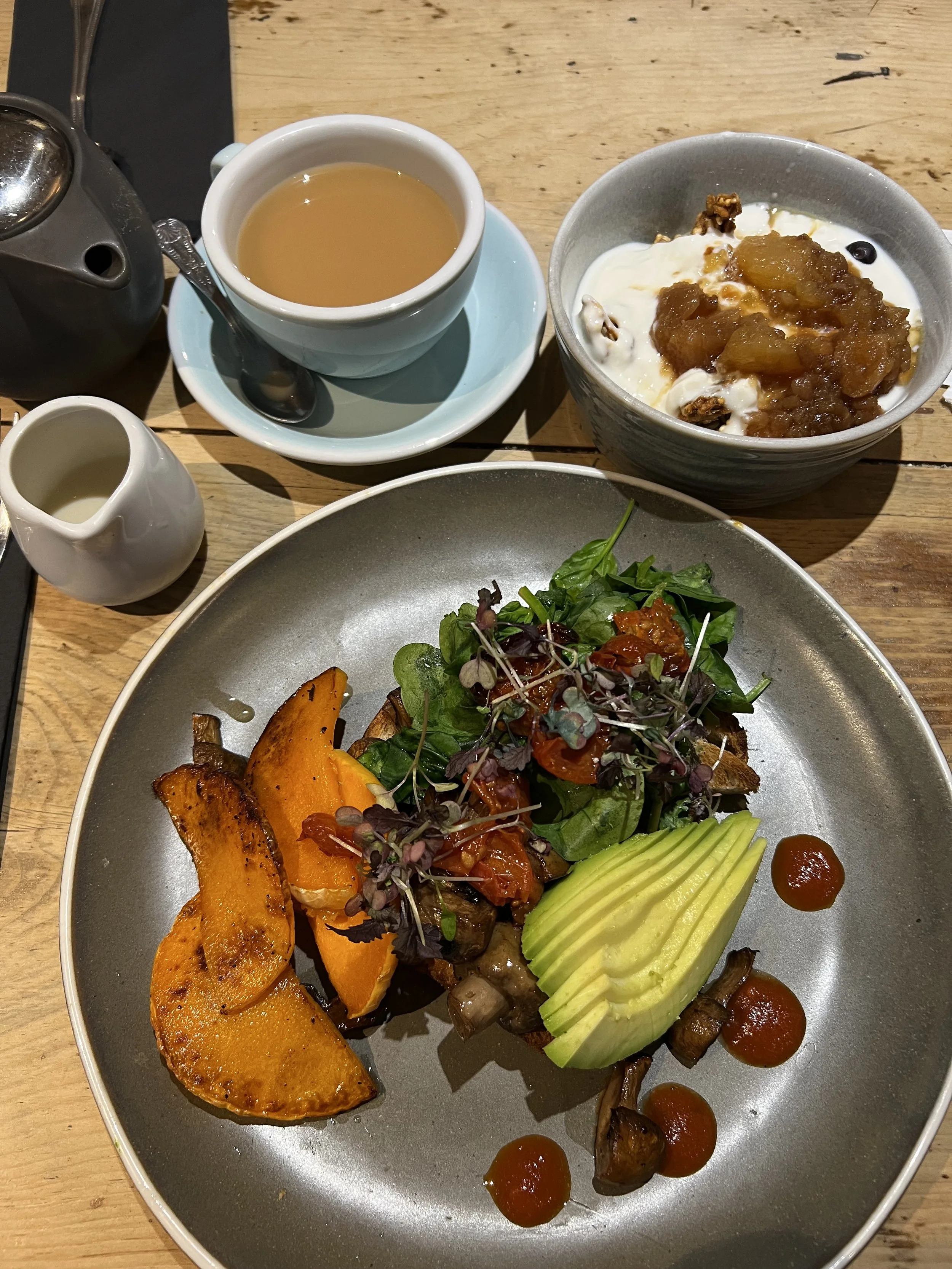 Amanda ate (believe it or not) the nutty & fruity homemade granola served with delicious dairy free yoghurt & seasonal fruit compote. Less granola than she would have liked, but good nonetheless. She had Scottish breakfast-blend tea which she loved.